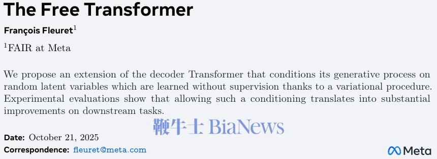 Meta FAIR部门的研究员François Fleuret发布了一篇名为《The Free Transformer》的论文,提出了一种对现有解码器Transformer模型的精妙扩展。