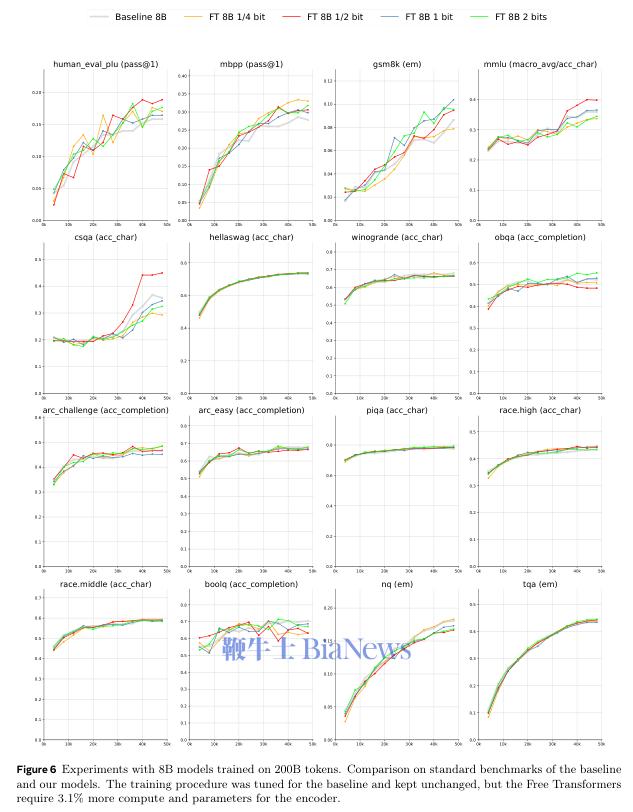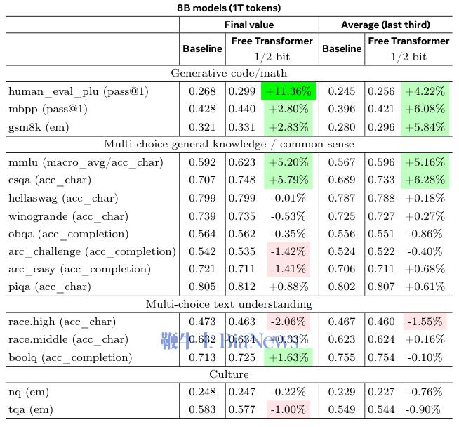 结果显示,在HumanEval+(代码生成)、MBPP(代码生成)和GSM8K(小学数学应用题)这些需要推理能力的基准上,Free Transformer取得了显著的性能提升。