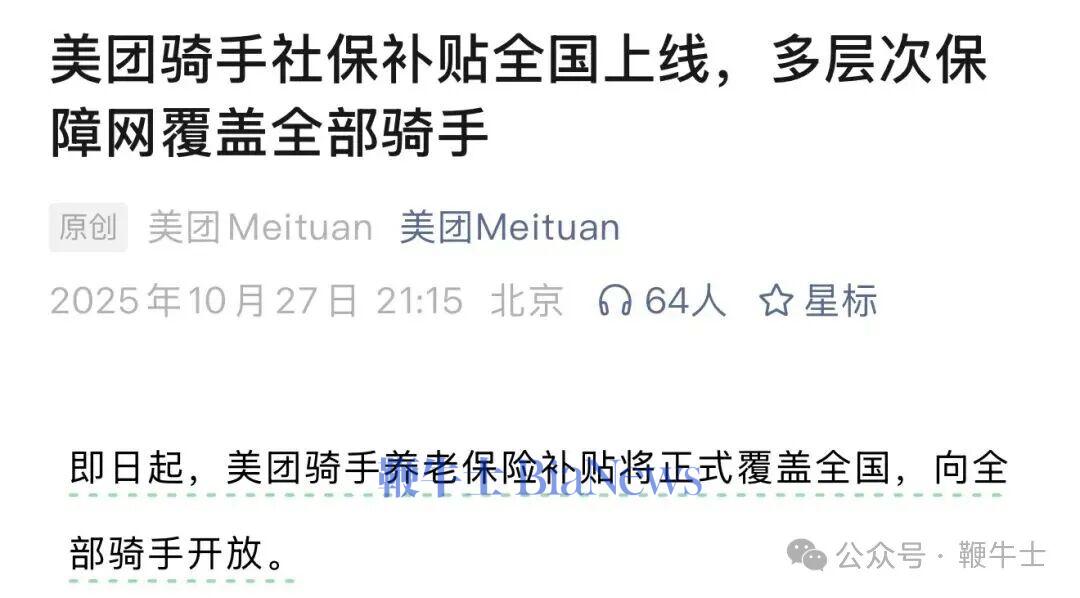 10月27日,美团宣布全国上线养老保险补贴,这是行业首个面向全部骑手的方案,也就是说,不论全职/兼职、跑单类型、时长,皆可受用此方案。