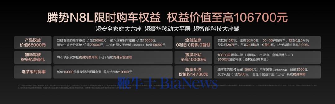 这两件事本来没有关联,但外界却容易把明星经理人与整个企业进行更为深度的捆绑。这没有什么错的地方,毕竟在品牌还没有树立起外界完整形象与观感的时间节点上,一个个性鲜明的领导者,能够快速帮助品牌建立起一套完整的形象。 说实话,从很多年前开始,我就不喜欢看赵长江的发布会,因为太絮叨。那种不厌其烦的,要把每个产品点掰开了揉碎了喂给你吃的耐心劲儿,对我来说是一种折磨。 没成想,后来雷军把这一套逻辑给发扬光大了,再接下去,就是如今把发布会越开越长的李斌。 现在我们再回过头来看,这种老板、高管明星化,把发布会当作各种财经kol年度演讲的路子,其实是一柄双刃剑。固然既可以树立起形象,又可以快速助推产品在市场上的销量,但过度依赖人的作用,又有可能随时被市场反噬。 比如,当年的腾势D9 就是在一个丝毫不被人关注的,电动、大型、MPV 细分市场杀出了血路。或者更进一步说,它甚至带动了很多厂商开始关注,并加入到这个细分市场的浪潮。同样的,我们现在关注到的小米、理想也同样因为管理者,陷入到了舆论风暴之中。 回过头来看腾势,现在腾势遇到的问题,其实也和很多人差不多。产品遇到了越来越激烈的市场竞争。在比亚迪体系内,走中高端的路线,其实更被寄予厚望,但路也确实更难走。这个时候,他们需要的是一个有力的、全新的品牌标签。而决定选择的这个标签,究竟是产品,还是人,其实需要腾势好好的抉择一番。 从昨天的发布会来看,腾势选择了N8L 这样一款产品。 选产品对不对? 首先,我想要明确的表态,选择 N8L 这样的强力产品来实现突围的路径,肯定是正确的,尤其是在中国这个竞争尤其激烈的市场中。 毕竟,对于汽车这样的大宗消费品来说,产品的品质与技术实力,在任何时候都是决定其市场生存状态的最核心参考指标。而对于腾势以及其背后的比亚迪来说,选择用更强的产品力来进行突围,首先是对自身实力的自信,同时也是对汽车工业的尊重。 而这样的路径选择,还有两个非常直观的利好。一是选择产品的用户,获得了最大程度的利益;二是在同一区间的竞争对手,会感受到空前的压力。 这两个逻辑其实是一体的。 比如,昨天N8L 的两个版本分别给出了 29.98万元和 32.98万元的售价,其实比早前产品发布时外界猜测的 30万到 35万元的售价区间,有了相当程度的下探。也就是说,消费者在认真比对过产品力之后,可以以更没有压力的购车预算与成本来选择它。 与此同时,N8L 给到消费者的购车体验,也直接给到了竞争对手以强烈的挤压。 比如,基于易三方技术平台打造,全系标配插混专用2.0T高效发动机、“天神之眼B—辅助驾驶激光版”(DiPilot 300)以及云辇-A智能空气车身控制系统等等技术的搭载,成为了腾势 N8L 的技术保障底牌。 这些都不是我们陌生的名词,对于熟悉比亚迪的用户而言,这些都是比亚迪近年来在新能源、智能汽车领域,获得的硕果与成就。对自己旗下走中高端市场路线的品牌应给尽给,为腾势N8L营造出了一个巨大的产品技术以及品牌护城河。 而对于更多的普通消费者来说,冰箱、彩电、大沙发是有的,超过5200mm的车身尺寸所带来的大六座布局;纯电230km以及2.0T发动机带来的,综合超过 1300km的续航水平;零百加速仅需3.9秒,百公里制动距离35.4米;以及后轮独立转向带来仅4.58米的转弯半径,灵活性超越A0级小车。这一系列的整体产品素质,基本上与售价形成了一个组合拳。 简单来说,消费者可以用更少的钱,买到综合素质更为全面的产品。而在竞争对手层面,要想的是如何与这样价格更具竞争力的产品来抢用户、抢市场。 同时,我们还要考虑的是,在如今这个竞争极为激烈的市场中,腾势也同样是开售就给出了一堆的金融政策与福利(比如,购置税最高15000元的差额补贴等等),以进一步提升自己的市场竞争力与号召力。 产品与市场的逻辑 事实上,在目前的整个汽车产业与市场中,我们正在被带着往更复杂的方向去走。我们已经习惯于每天接收由各种商业鬼才研发出来的,各种奇怪的营销论调。 我并不是说,这样的营销手段是错的。毕竟,确实有很多的公司,通过营销与用户关联,实现了销量的起飞。但更多时候,卖车首先应该关注的是车本身。 这在目前的市场中,好像反而成为了一个容易被忽略的点。 确实,如果单纯从产品力角度来看,大六座SUV,混动综合续航里程超过1000公里,以及“冰箱、彩电、大沙发”,是目前市场上最为核心产品竞争种类。也就是说N8L并没有像当年的D9一样,悄悄潜入一个市场竞争蓝海,从而创造佳绩。他们进入的是真正有量、但获取量也更困难的市场。 但从另一个角度来看,只有这样的市场,才能真正为一个品牌能否走通高端路线、能否被市场承认,给出证明。 而从产品的角度来看,目前对于普通消费者来说,对于新奇技术的猎奇性探索,正在随着他们所接触到的各类信息,逐渐从发散转变为收敛。汽车技术的发展必然依旧滚滚向前,但消费者对于安全的兴趣,已经开始逐渐大于对尝鲜的热爱。 从这个角度上来看,在整个行业率先官宣官方为智能泊车技术兜底的比亚迪,显然给人所有人留下了一个善于研发技术,且善于研发靠谱技术的好印象。这对于腾势来说是非常重要的利好。 所以,一个简单的站在消费者角度的市场逻辑也就诞生了:别人有的我要有,别人贵的我要便宜,别人只有新,