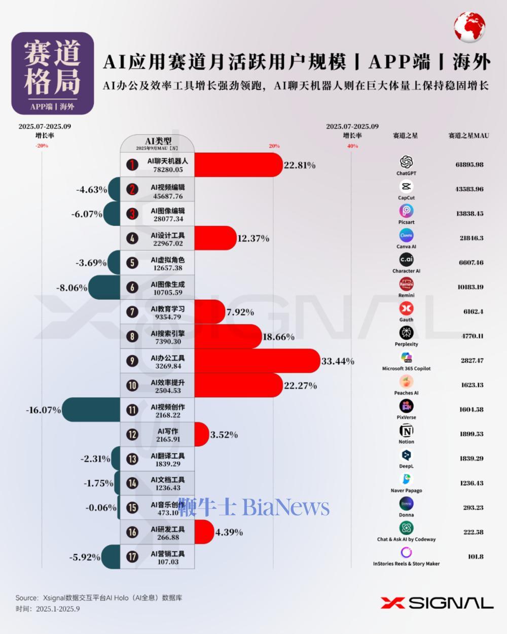 根据Xsignal AI Holo(AI 全息)数据库数据显示,AI聊天机器人(7.83亿MAU)地位稳固,Q3增长超22%。成熟的内容编辑赛道(视频/图像)体量庞大,但Q3已现萎缩。鲜明对比下,以AI办公(Q3增33.44%)和AI效率(YTD增2423.67%)为代表的生产力工具正成为新增长引擎,爆发力强。