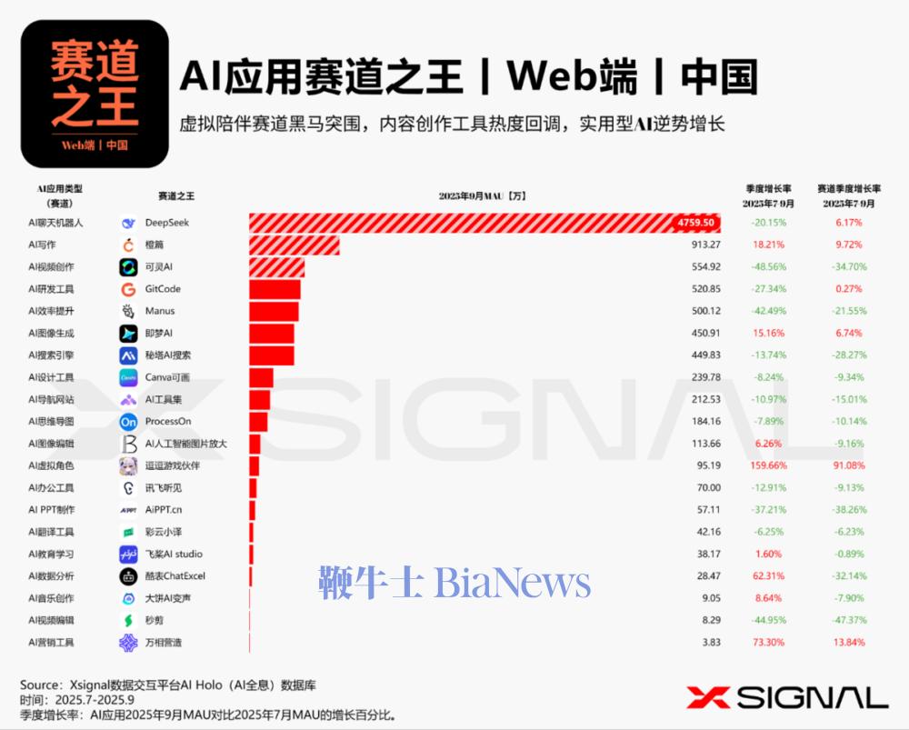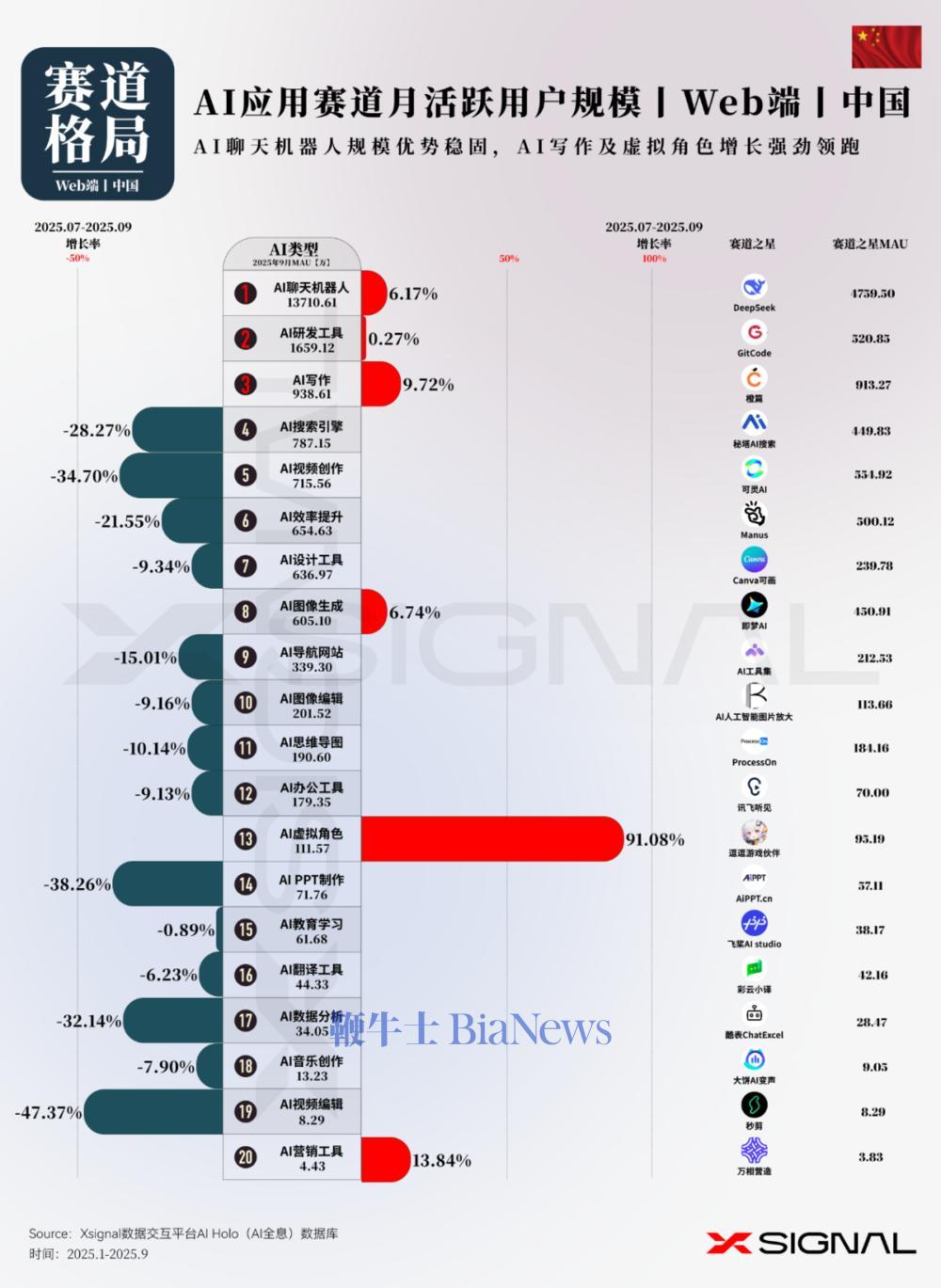 根据Xsignal AI Holo(AI 全息)数据库数据显示,中国市场Web端AI聊天机器人(1.37亿MAU,年增25.94%)以绝对优势主导市场,而AI效率提升(年增351.7%)和AI虚拟角色(年增255.6%)等垂类展现出最强增长动力。