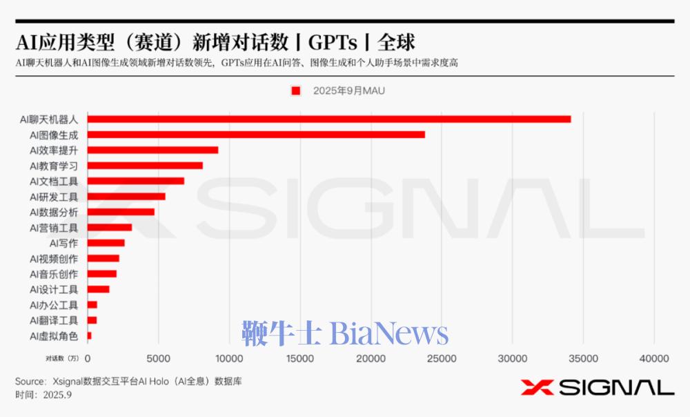 根据Xsignal AI Holo(AI 全息)数据库数据显示,2025年9月全球GPTs应用各细分赛道的月新增对话数分布情况来看,AI聊天机器人以超过34000万的新增对话数遥遥领先,这主要得益于其广泛的应用场景和普适性功能。作为人机交互的核心入口,聊天机器人覆盖了智能问答和客户服务等多元化需求,其操作简便、贴近日常生活的特性使其成为用户高频互动的首选。紧随其后的是AI图像生成应用,近24000万的新增对话数反映出其在创意设计和社交媒体内容生产领域的强劲需求,用户通过可视化表达实现了个性化创作,这种兼具娱乐性和实用性的特点有效提升了用户参与度。