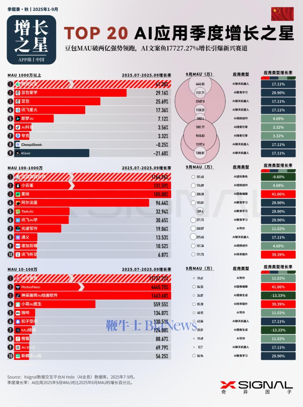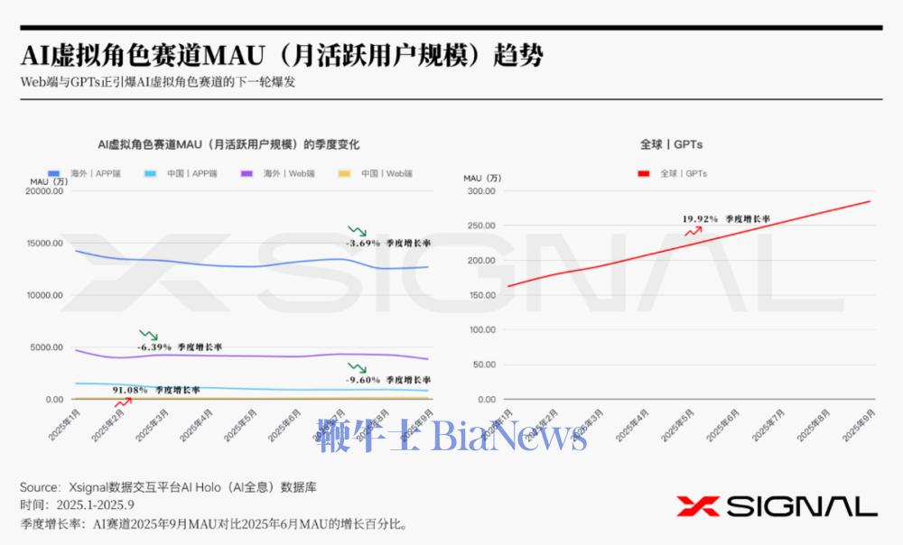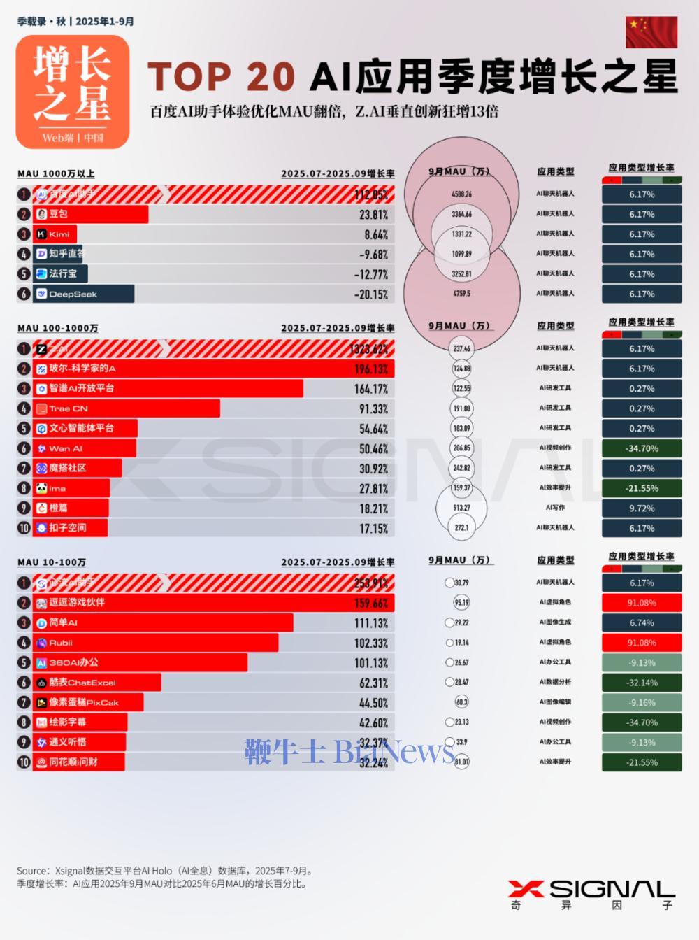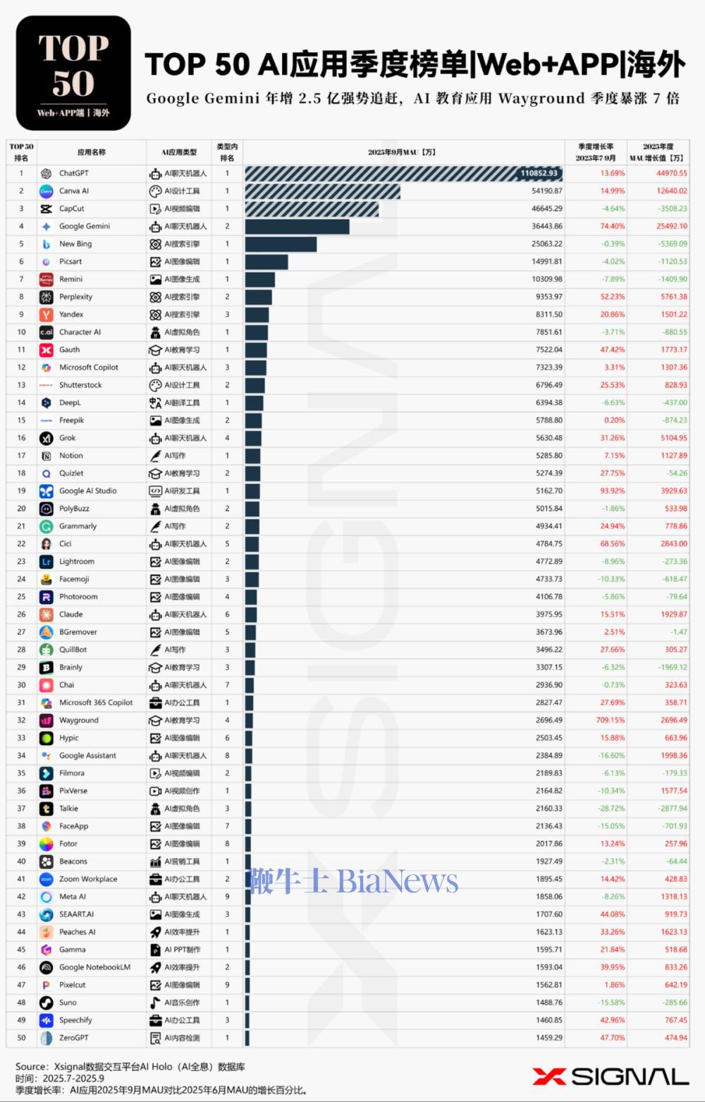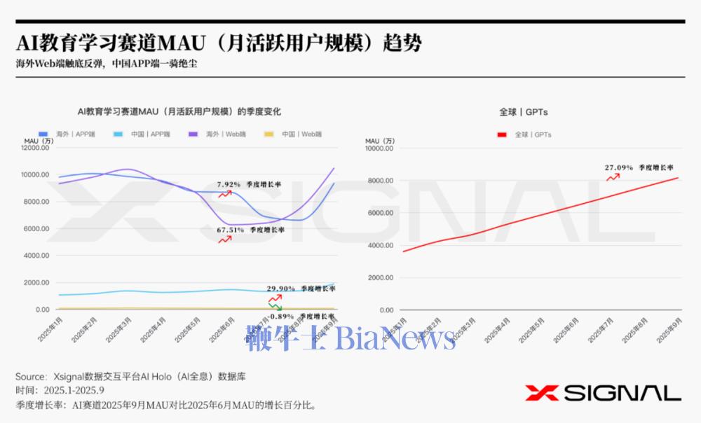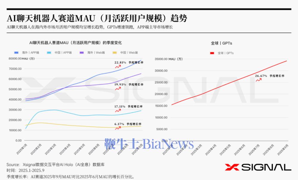 中国APP市场: 同样增长迅速。根据Xsignal AI Holo(AI 全息)数据库数据显示,中国市场APP端MAU从1月的7695万增长至9月的10104万,累计增长46.93%,已形成庞大的用户基盘。然而,数据揭示了潜在的增长瓶颈:其第三季度增长率(3.32%)已明显放缓。这或暗示市场渗透已达阶段性高点,或面临更激烈的同质化竞争。“移动优先”已成行业共识,深度融合AIGC、多模态交互与即时服务是巩固移动霸主地位的关键。