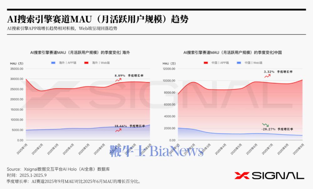 海外Web市场:虽累计微降5.43%(从1月的2.99亿降至9月的2.81亿),但其MAU体量依旧是APP端的近4倍,基本盘极其稳固。更重要的是,其第三季度环比增长8.89%,显现出清晰的“触底反弹”迹象。这表明在专业、深度及桌面办公场景下,Web端AI搜索仍具不可替代的价值,市场已进入存量优化与体验升级的博弈阶段。