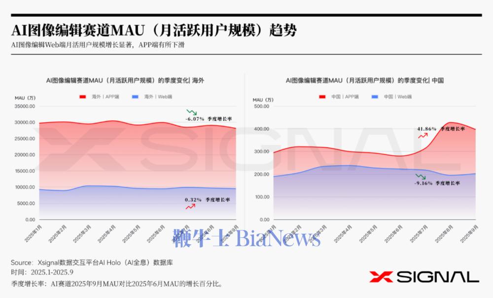 2025年中期,AI图像编辑市场呈现出新的动态。第一季度“Web端增长,APP端承压”的趋势在第二季度有所延续,但第三季度则出现了显著的市场分化,尤其在中国市场,APP端出人意料地实现了爆发式增长,而Web端则在国内外市场普遍面临增长瓶颈。