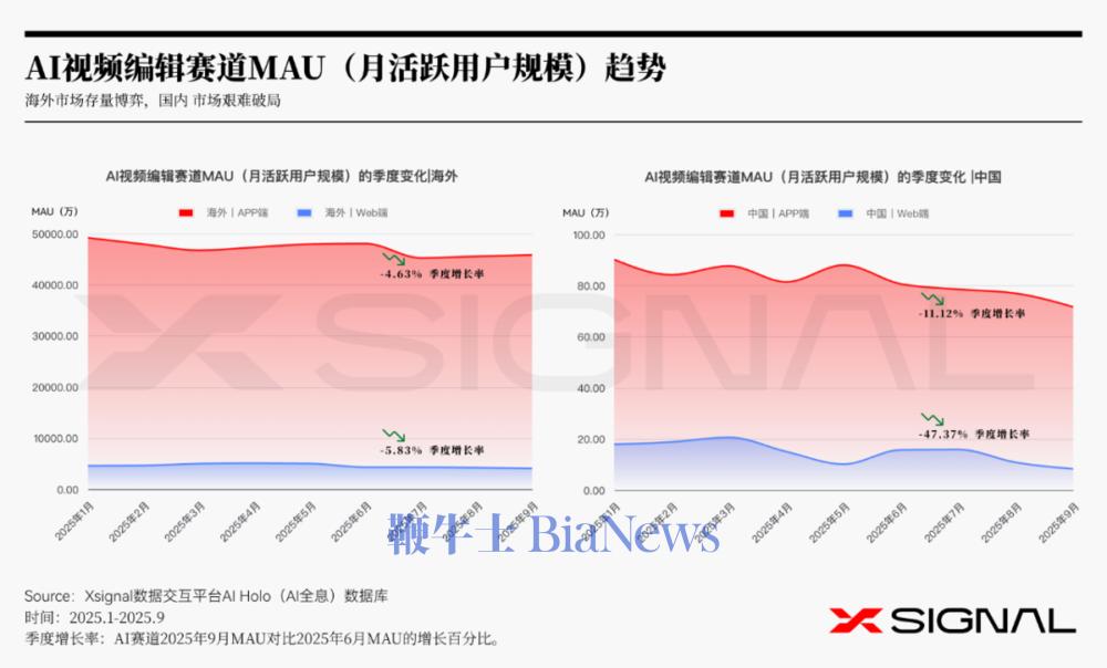 在AI视频编辑的全球版图上,移动APP端是无可争议的绝对主战场。无论是海外市场以超过Web端11倍的体量,还是国内市场超8倍的规模,都印证了APP在即时创作与社交分享场景中的核心地位。然而,表面的繁荣之下暗流涌动——2025年全球双端数据的同步下滑,正揭示一场深刻的行业变局与共同困境。