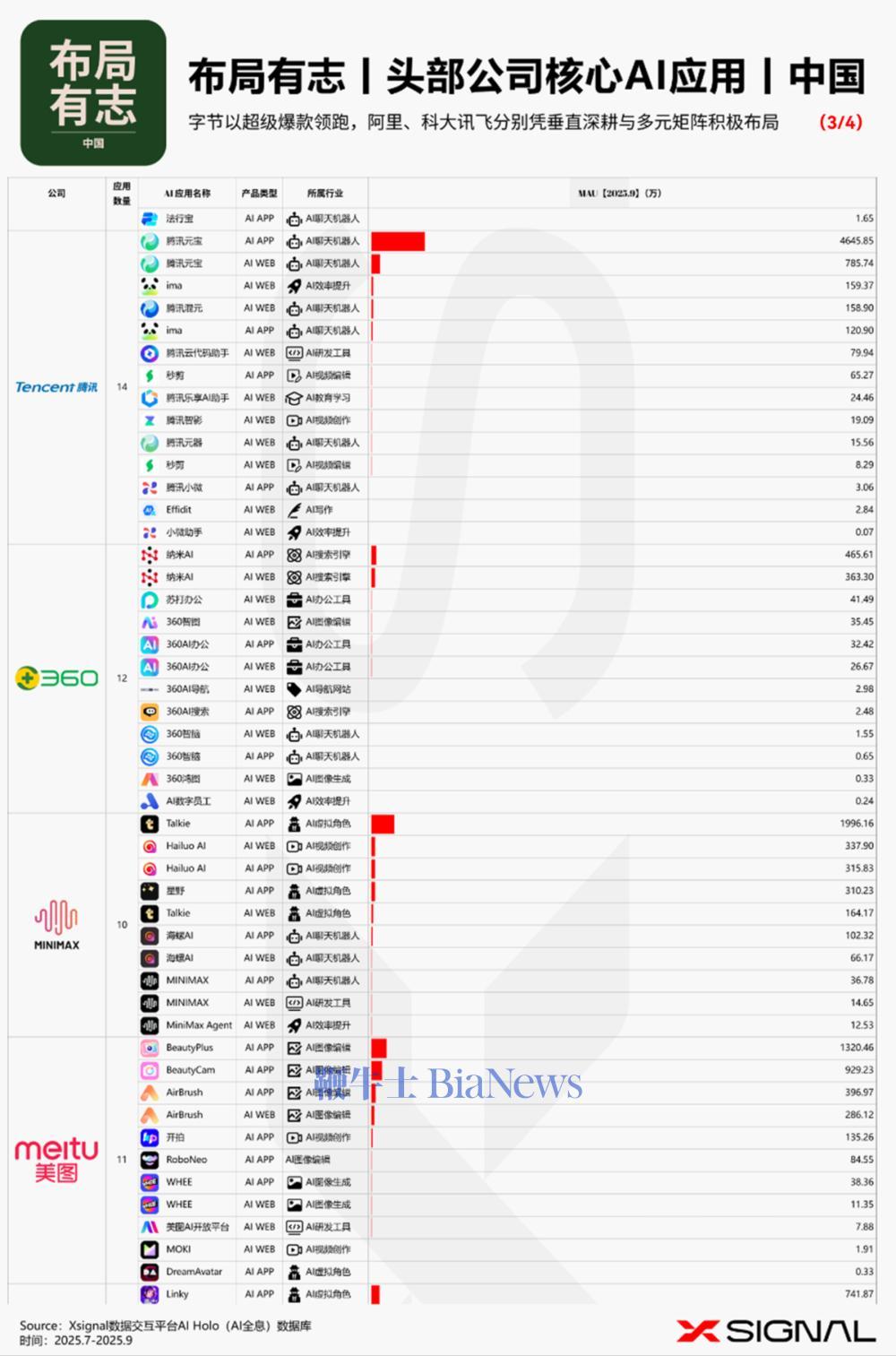 《季载录·秋丨Xsignal全球AI应用行业季度报告丨2025》正是在这个价值归位的关键节点,为您呈现这份市场的“秋收报告”。它基于秋季的最新数据,旨在描绘一个去伪存真、格局初定的AI应用新版图。这是一份验证“生存法则”的成绩单。9月的数据,将春季时浮现的趋势,彻底固化为市场的铁律:AI的胜利,终究是场景的胜利。 曾经备受瞩目的通用大模型应用,在用户规模上依然步履维艰;相反,如字节跳动的“豆包”、美图旗下的AI影像矩阵等深度嵌入具体场景的产品,其数千万级的月活跃用户(MAU)规模已经证明,将AI能力“润物无声”地融入用户既有工作流与生活娱乐,是通往大众市场的唯一路径。