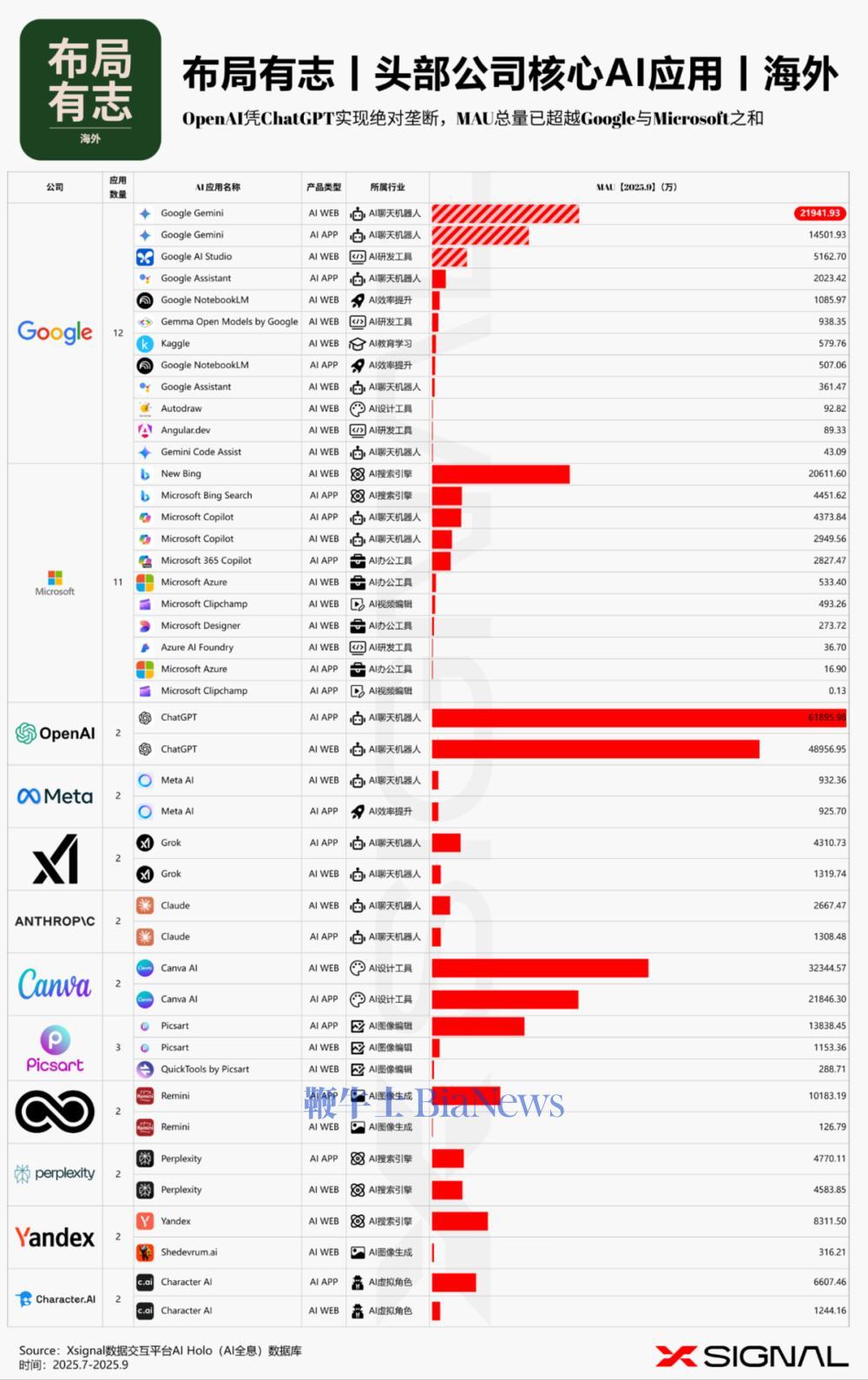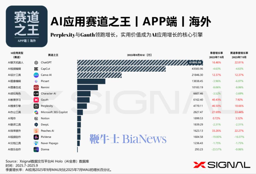根据Xsignal AI Holo(AI 全息)数据库数据显示,2025年9月海外AI应用月活跃用户(MAU)达到14.48亿,季度增长率为19.16%,这一在高基数上实现的强劲增长,标志着市场已从早期用户扩张阶段,步入价值深挖的成熟期。其核心增长飞轮在于:完善的云服务与智能终端等技术基座为应用普及铺平了道路;而用户成熟的付费习惯(如OpenAI的订阅制)则为技术创新提供了持续的商业动力;最终,AI在办公、创意、教育乃至生活等场景的无限拓展,将技术与商业价值落地,持续吸引并沉淀用户,构成了驱动MAU增长最根本的动力。
