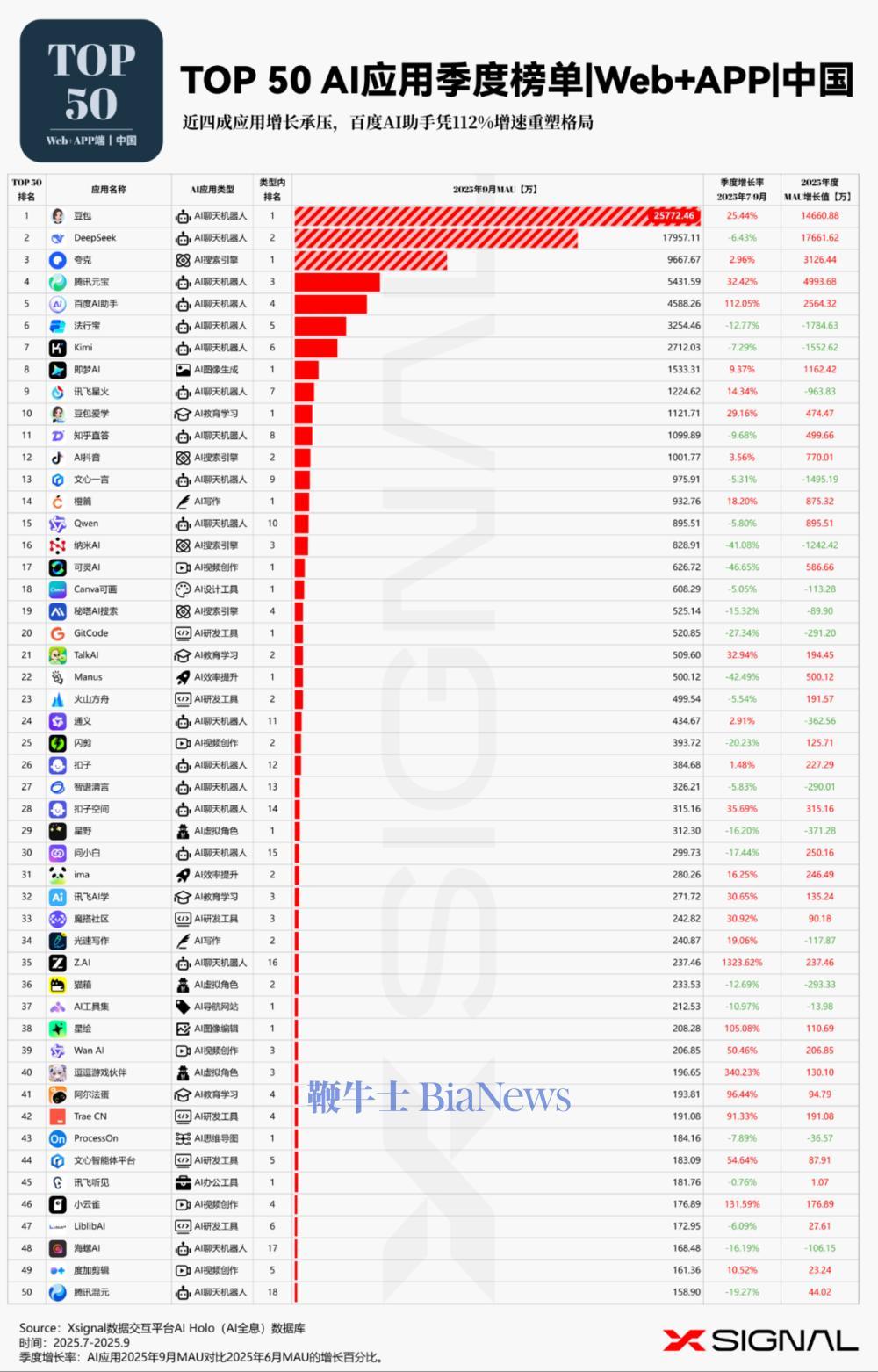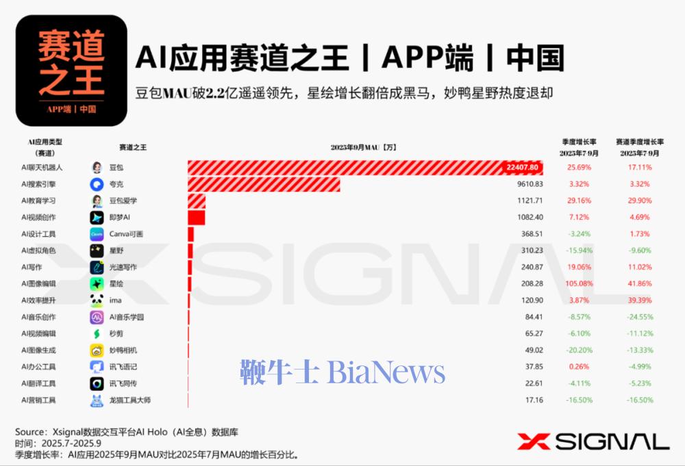 2025年的秋天,中国AI应用赛道迎来了一个“拨云见日”的时刻。如果说春天是“百模大战”的喧嚣与萌芽,夏天是应用场景的野蛮生长,那么此刻的秋日,则带来了沉淀后的清醒与收获。曾经围绕模型的狂热与想象正逐渐退潮,市场开始用最朴素的标尺——用户价值与活跃规模——去度量真正的胜出者。