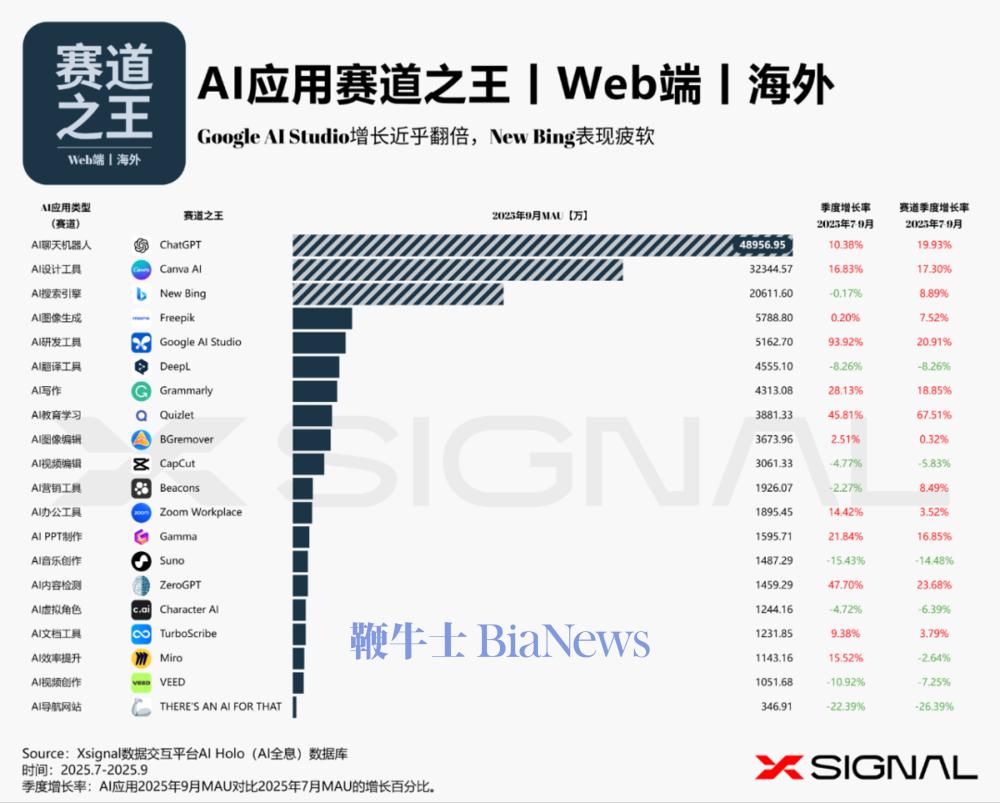 在2025年第三季度的海外Web端AI应用赛道之王榜单中,MAU(月活跃用户)达到亿级的应用共有3个,千万量级的应用有16个,百万量级的应用有1个。从季度增长来看,有8款应用的MAU呈现下滑趋势,其余12款应用均实现增长。其中,AI研发工具赛道的Google AI Studio季度增长率高达93.92%,其MAU突破5100万,成为本季度增长最快的应用。