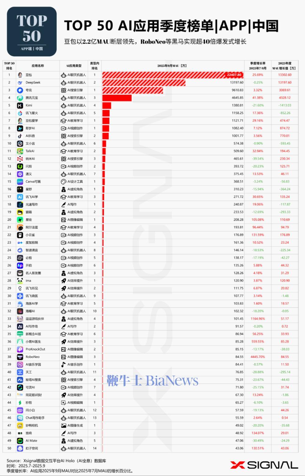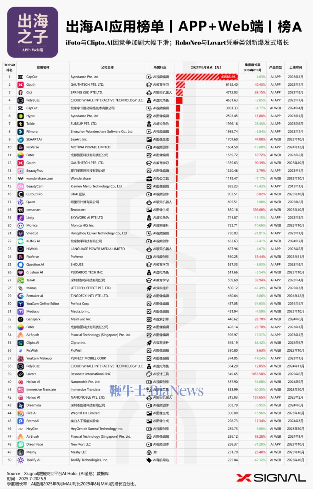 美图的RoboNeo:作为一款2025年6月才上线的AI图像编辑APP,便实现了4445.70%的惊人增长,显示出美图在图像领域深厚的技术积累和强大的市场推广能力。