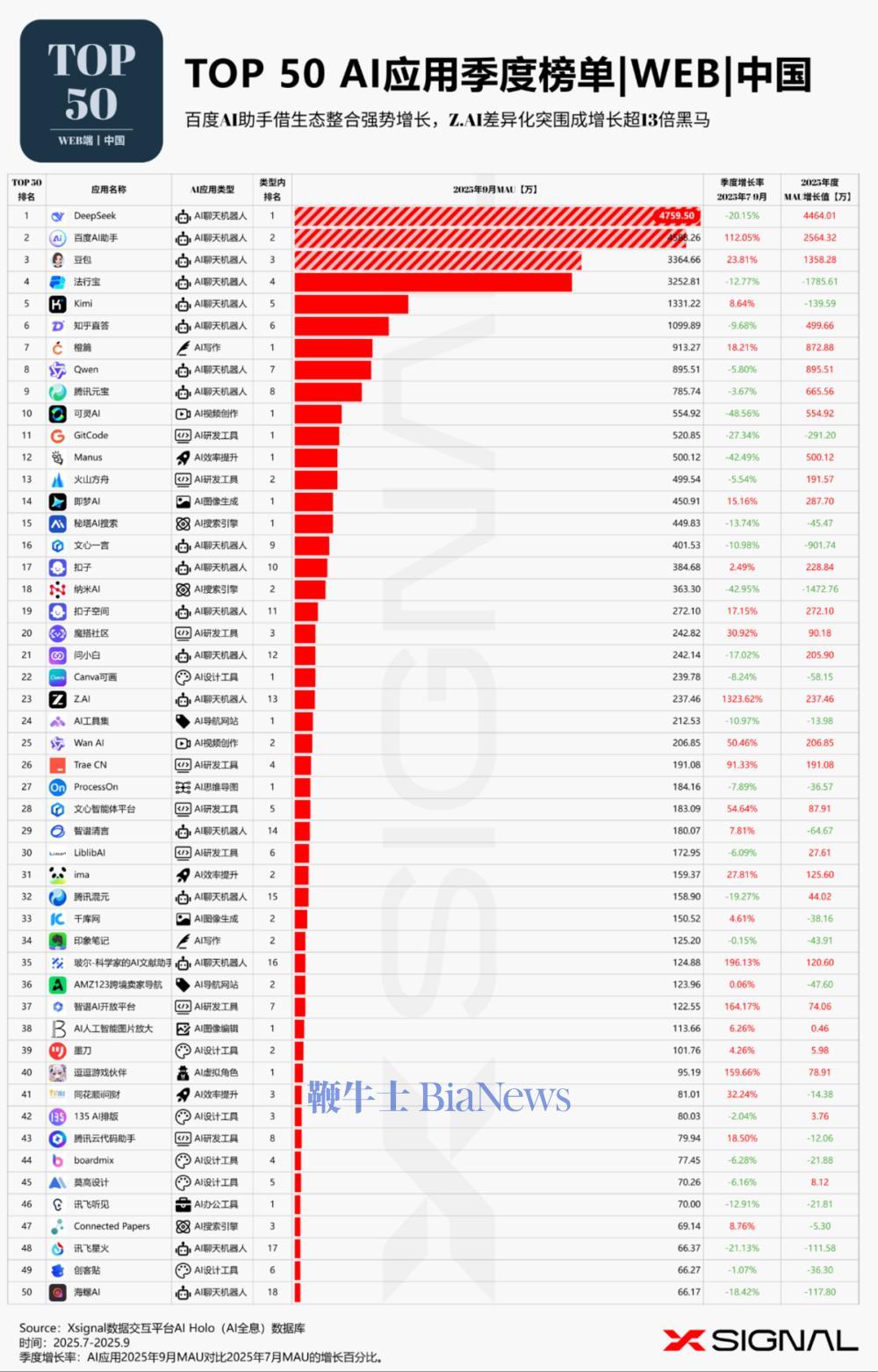 最高增长:AI设计工具Lovart实现了惊人的1053.58%的季度增长,作为2025年6月上线的新品,其爆发式增长预示着AI设计工具赛道存在巨大潜力。