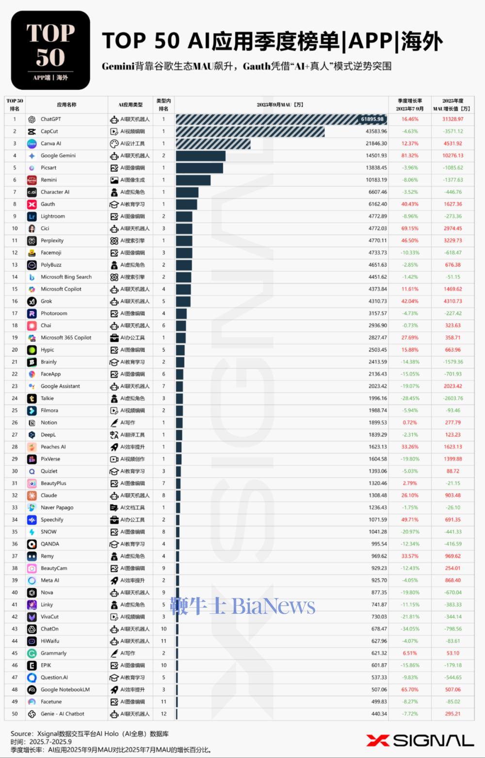 本季度AI应用市场的增长呈现“冰火两重天”的态势。榜单中,29个应用实现增长,21个出现下滑,显示出市场竞争的激烈与分化。