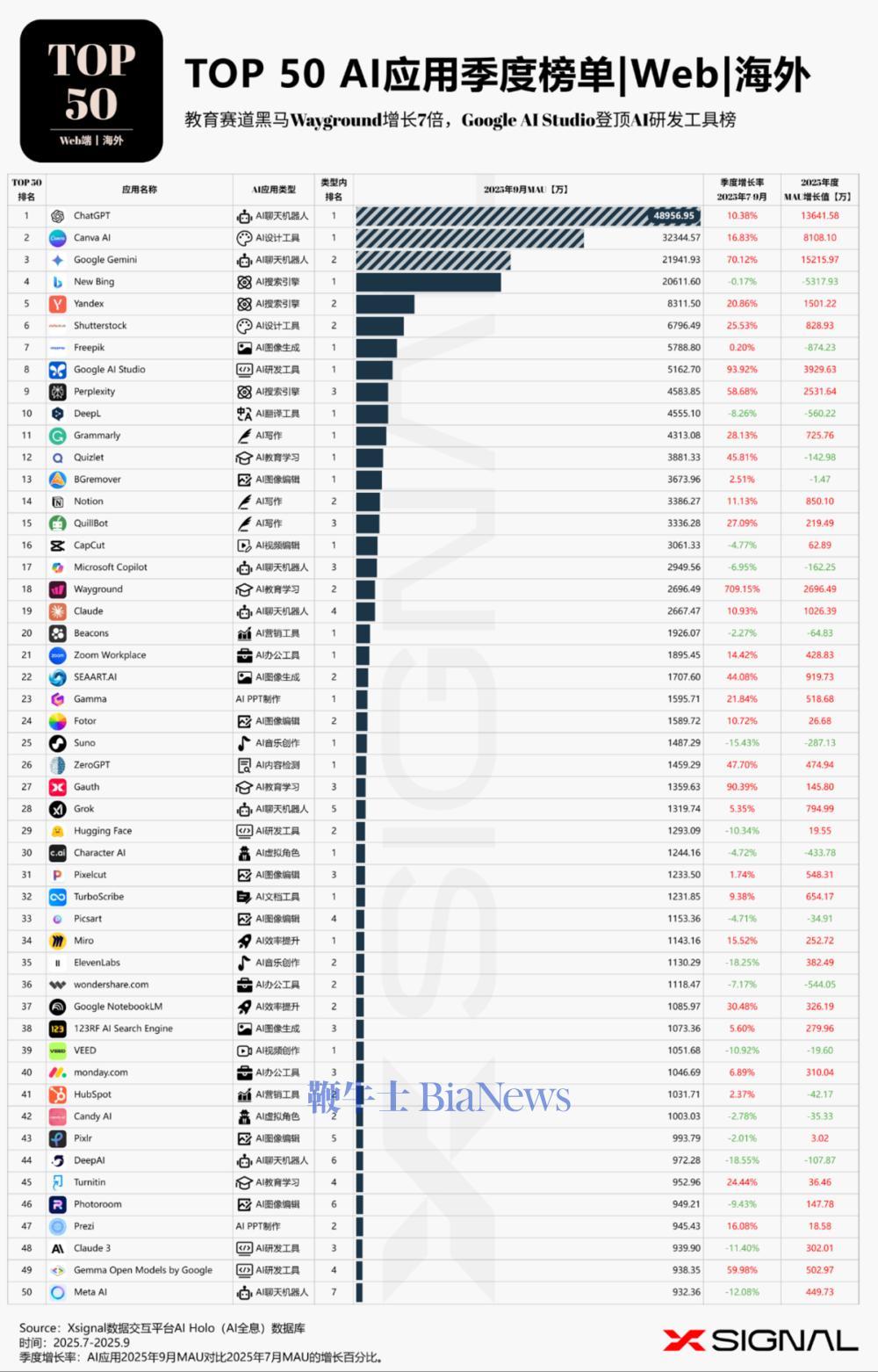 本季度,榜单中取得增长的应用共有32个,占Web TOP50应用总数的64%。增幅最高的是Wayground(+709.15%)和Google AI Studio(+93.92%)。18个AI应用呈下降趋势,平均降幅约为8.34%,降幅最大的应用是DeepAI(-18.55%)。整体来看,Web端第三季度增长势头强劲,市场虽出现分化,但对AI工具的整体需求量较高,仍处在快速扩张阶段。
