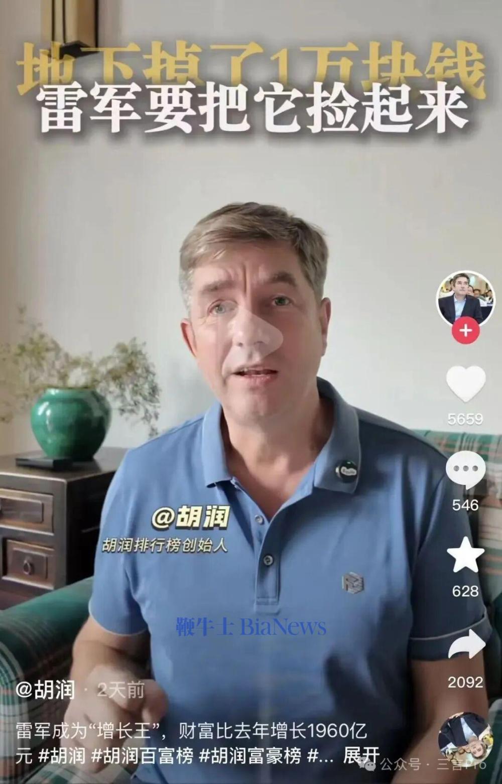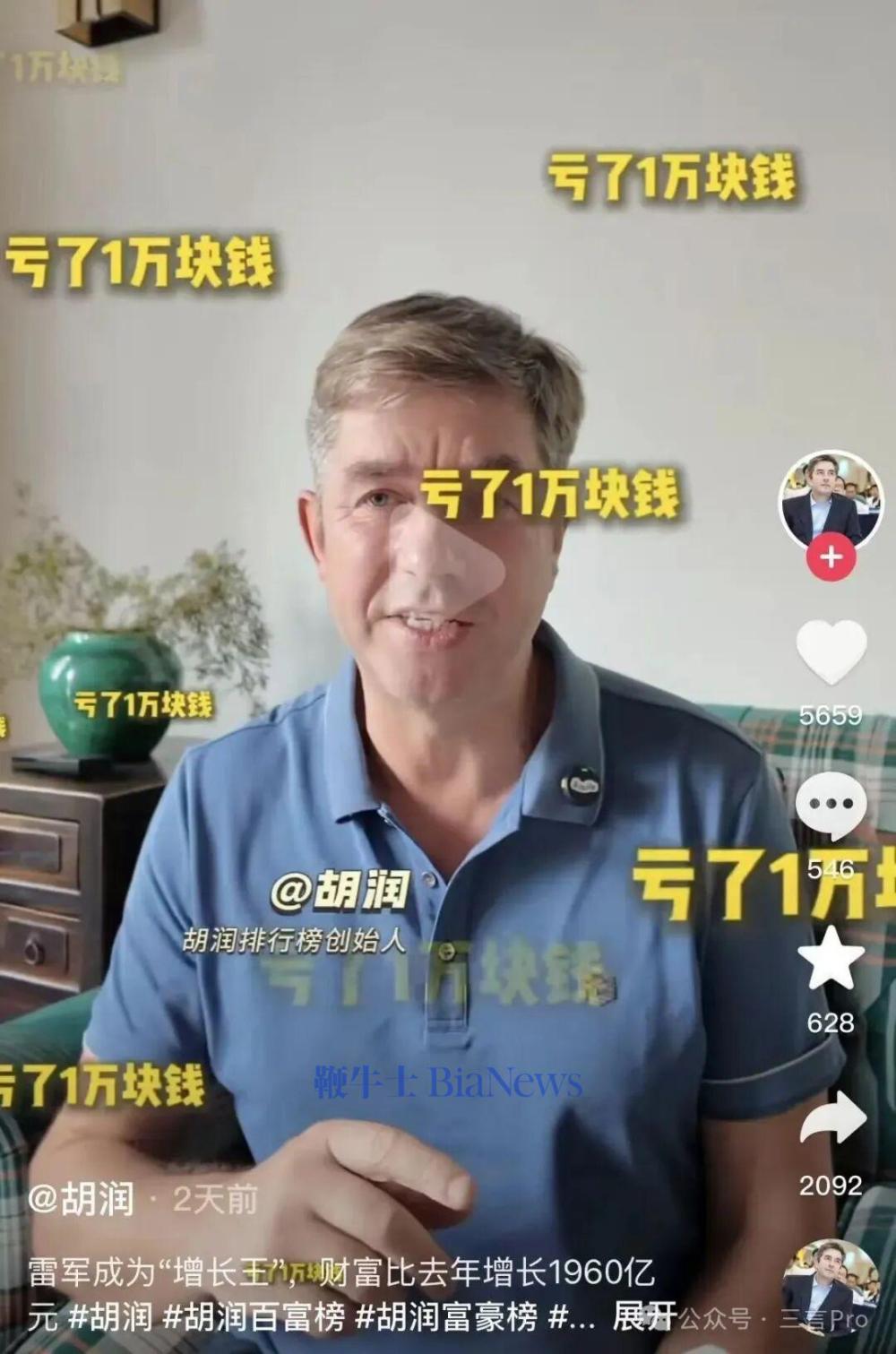 对此,胡润排行榜创始人胡润调侃称雷军“地上掉了1万块钱,雷军要把它捡起来,那他已经就亏一万块”。