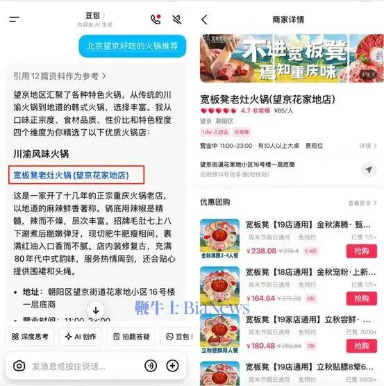 比如,在豆包输入“北京望京好吃的火锅推荐”,结果会给出不同类型的火锅店,点击蓝色字体的店家名称,进入抖音商家详情页面,可购买团购优惠券,不可谓不方便。