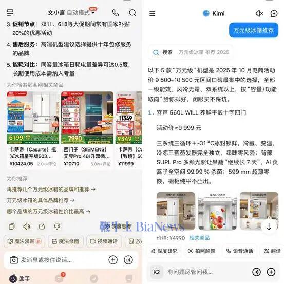 “万元级冰箱推荐”,同样的问题向Kimi、元宝、通义、文小言、DeepSeek提问,只有Kimi和文小言的回答中出现商品链接,接入的是淘宝和京东,但点击商品链接发现,大多是第三方代理商家店铺,而非官方旗舰店。