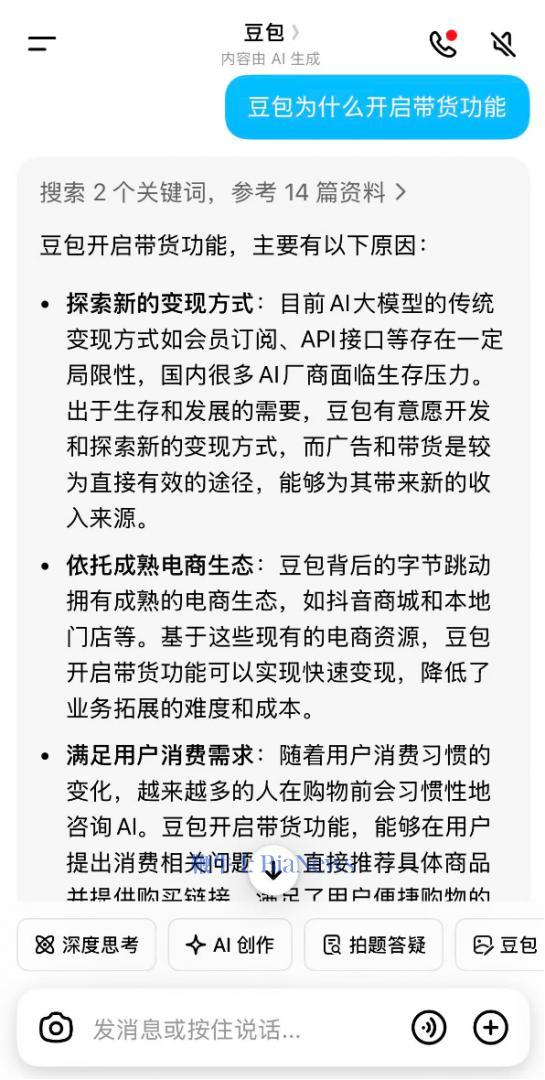 豆包们开启带货也有商业变现的考量。当小编发问为什么上线带货功能时,豆包自己的回答也提到了这一点:探索新的变现方式。