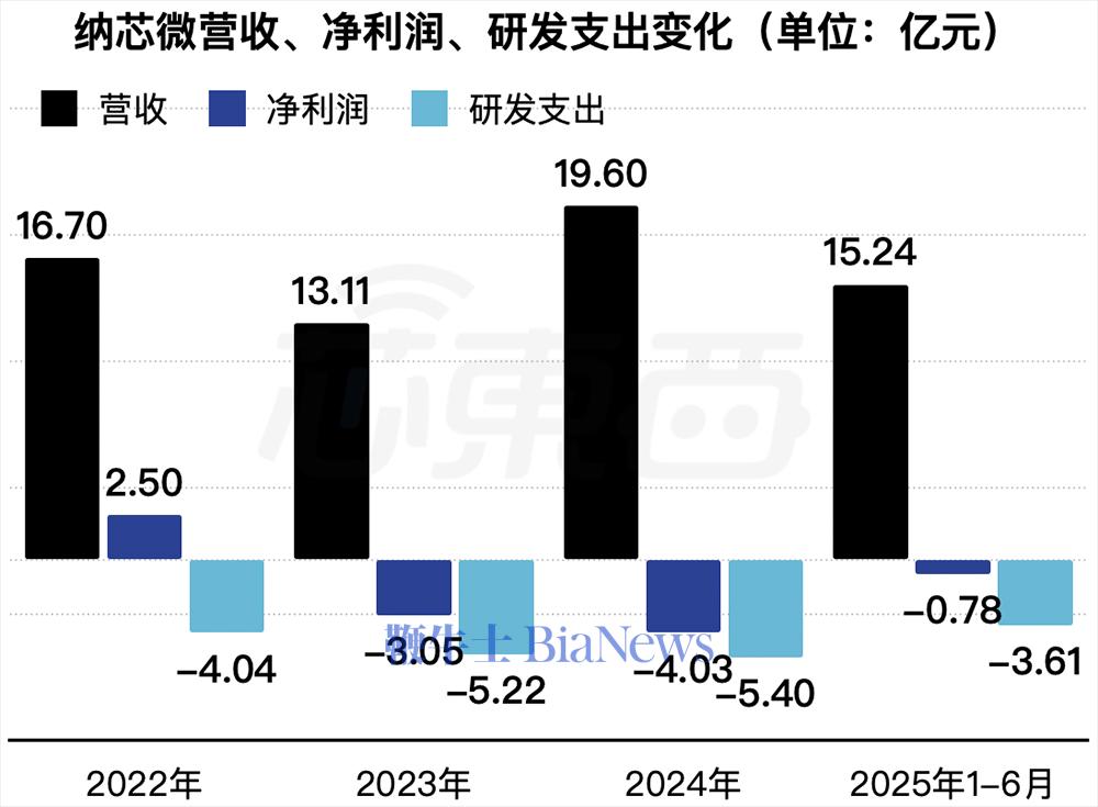 2022年、2023年、2024年、2025年1-6月,纳芯微收入分别为16.70亿元、13.11亿元、19.60亿元、15.24亿元,净利润分别为2.50亿元、-3.05亿元、-4.03亿元、-0.78亿元,研发费用分别为4.04亿元、5.22亿元、5.40亿元、3.61亿元。