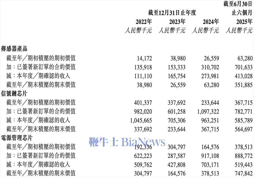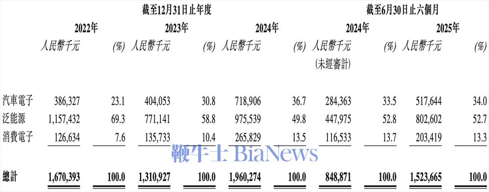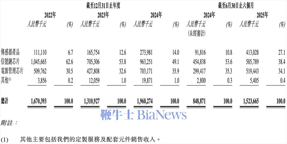 其2025年上半年收入同比增长79.5%,主要由于汽车电子领域的需求持续增长、工业及自动化领域的需求复兴,以及上海磁传感器企业麦歌恩的业务及财务表现整合。纳芯微主要有传感器产品、信号链芯片、电源管理芯片三条产品线。2022年、2023年、2024年、2025年1-6月,纳芯微传感器产品、信号链芯片、电源管理芯片的总销量分别为14.31亿颗、19.16亿颗、30.01亿颗、21.60亿颗。其综合毛利率分别为48.5%、33.9%、28.0%、32.9%。近几年毛利率下降的主要原因是模拟芯片市场竞争激烈,导致纳芯微调整产品价格,以保持价格竞争力。从应用领域来看,泛能源贡献了纳芯微超过半数的收入,汽车电子贡献的收入占比逐年增长。过去三年半,该公司有超过98.90%的收入来自中国。