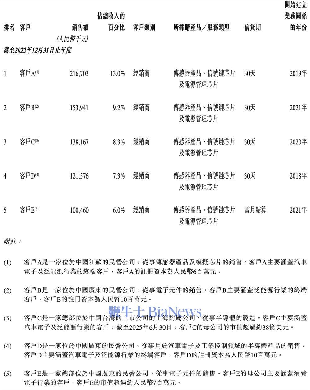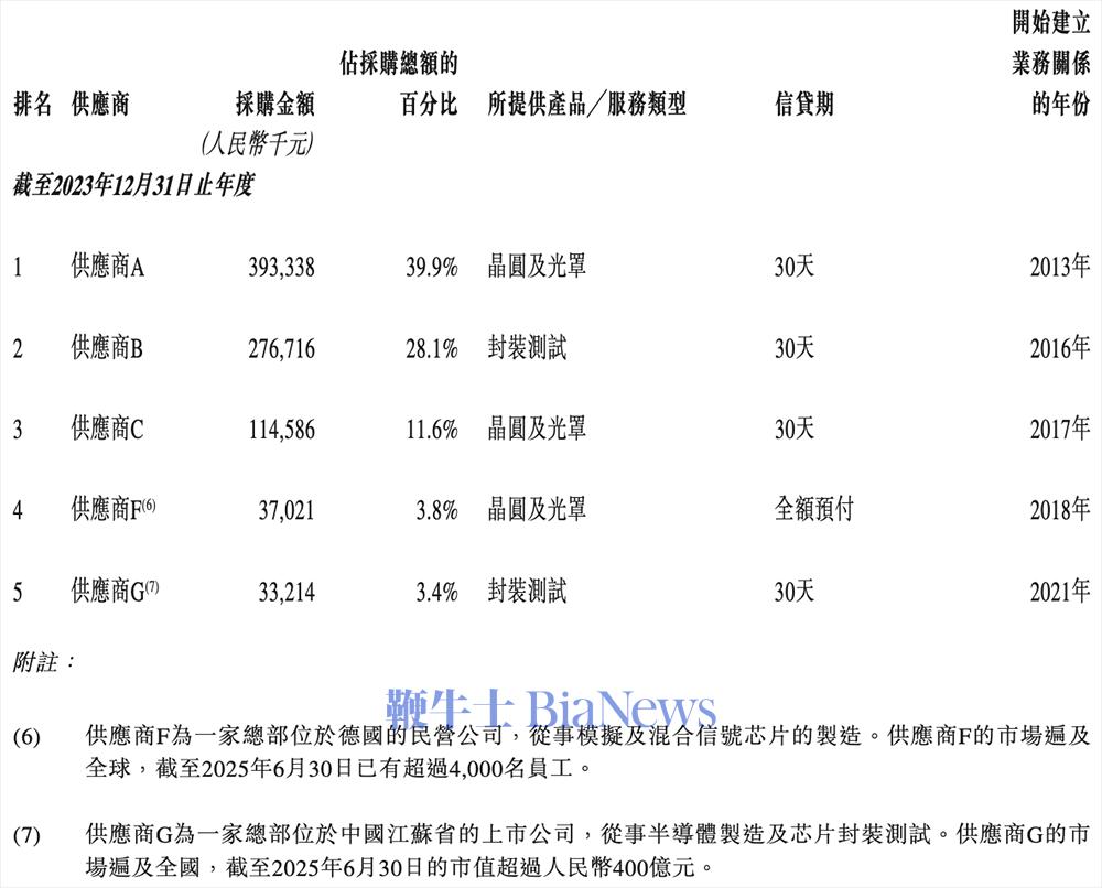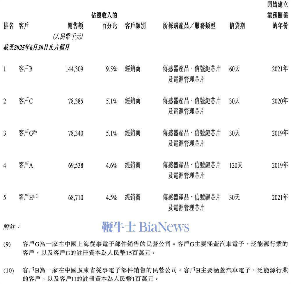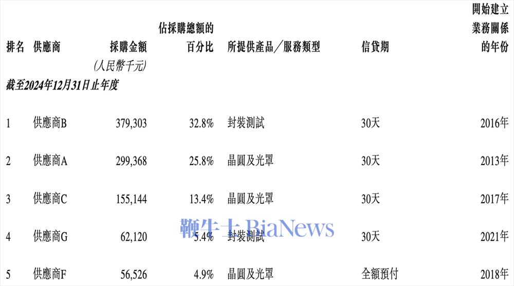 2022年、2023年、2024年、2025年1-6月,纳芯微前五大客户合共产生收入分别占其总收入的43.8%、43.0%、36.9%、28.8%。截至最后实际可行日期,纳芯微有13家晶圆代工供应商及19家封装测试供应商。2022年、2023年、2024年、2025年1-6月,该公司向前五大供应商采购的金额分别占采购总额的90.5%、86.8%、82.3%、86.4%。纳芯微主要向供应商A采购晶圆代工制造产品,向供应商B采购芯片测试封装服务。供应商A为位于中国上海的半导体制造商。纳芯微于2013年开始与供应商A进行业务合作。供应商B是一家总部位于香港的上市公司,其有几家在中国从事芯片测试封装服务的附属公司。纳芯微于2016年开始与供应商B进行业务合作。