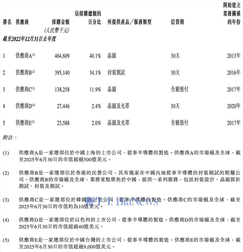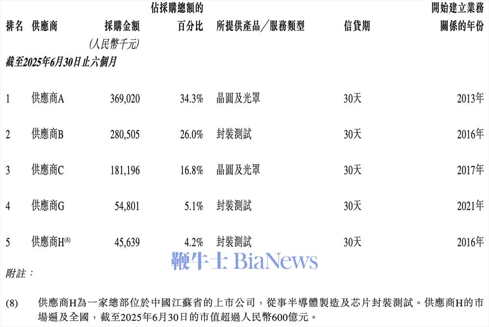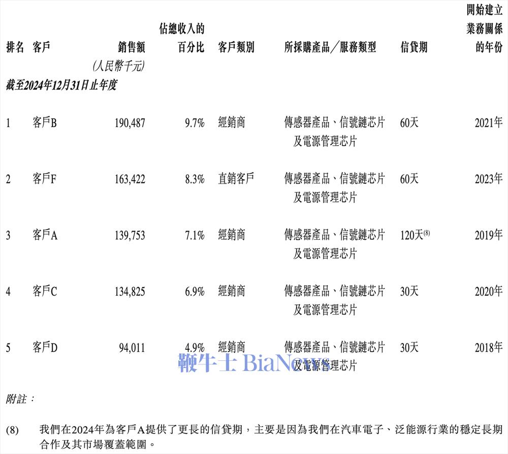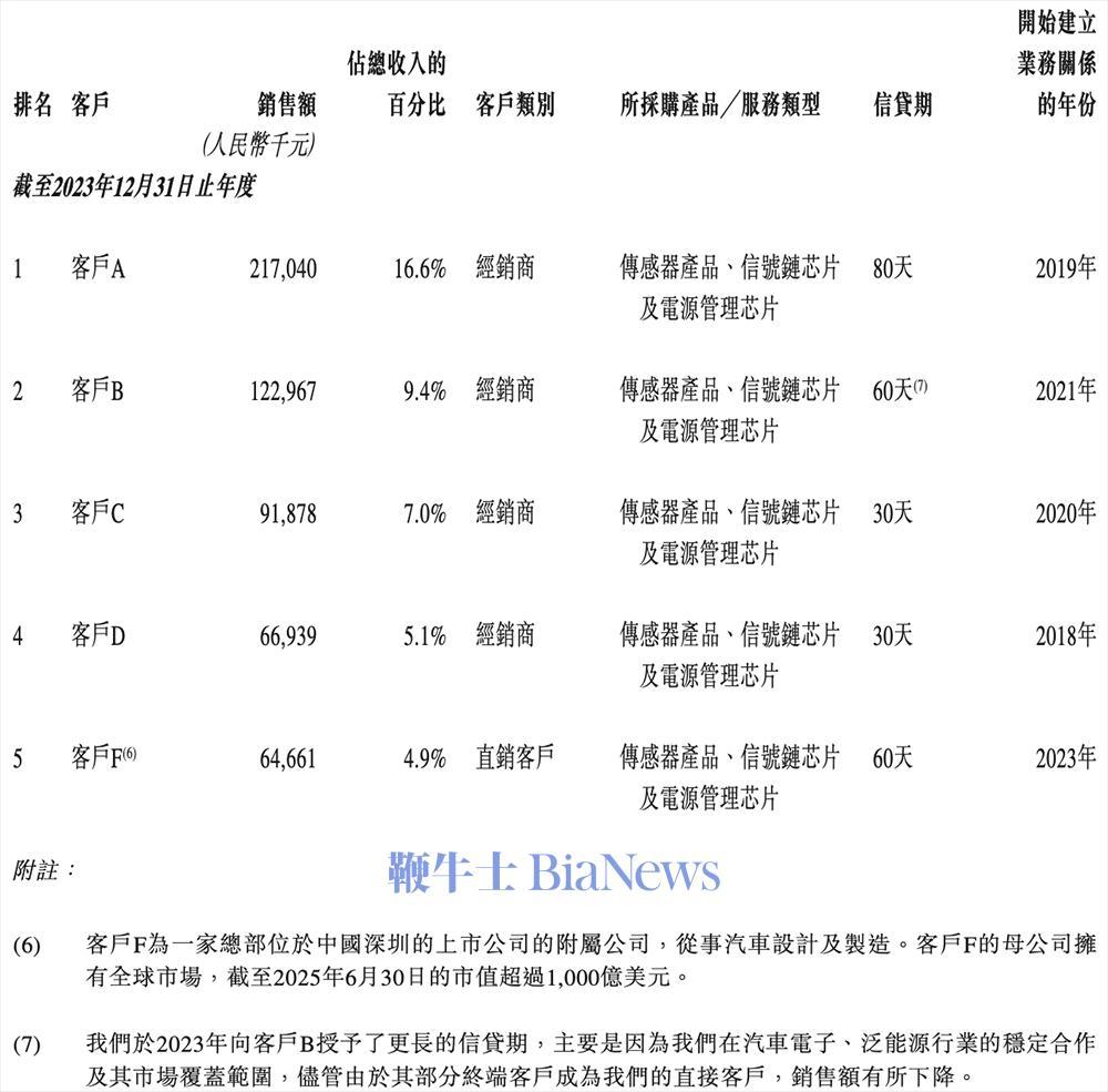 2022年、2023年、2024年、2025年1-6月,纳芯微前五大客户合共产生收入分别占其总收入的43.8%、43.0%、36.9%、28.8%。截至最后实际可行日期,纳芯微有13家晶圆代工供应商及19家封装测试供应商。2022年、2023年、2024年、2025年1-6月,该公司向前五大供应商采购的金额分别占采购总额的90.5%、86.8%、82.3%、86.4%。纳芯微主要向供应商A采购晶圆代工制造产品,向供应商B采购芯片测试封装服务。供应商A为位于中国上海的半导体制造商。纳芯微于2013年开始与供应商A进行业务合作。供应商B是一家总部位于香港的上市公司,其有几家在中国从事芯片测试封装服务的附属公司。纳芯微于2016年开始与供应商B进行业务合作。