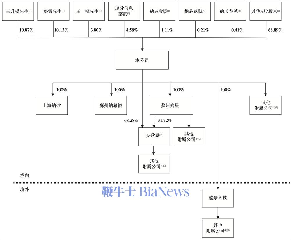 王升杨今年41岁,硕士毕业于北京大学电子与通信工程专业,目前担任纳芯微的董事、董事长、总经理。盛云今年43岁,硕士毕业于复旦大学微电子学与固体电子学专业,目前担任纳芯微的董事、副总经理、研发负责人。纳芯微董事兼副总经理王一峰与王升杨是北大硕士同窗。王升杨、盛云、王一峰、瑞矽信息咨询、纳芯壹号、纳芯贰号、纳芯叁号构成上市规则项下的单一最大股东集团,且其单一最大股东集团合共持有纳芯微投票权的31.13%。2024年6月,纳芯微订立股份转让协议,向上海矽睿科技及上海莱睿分别收购其于上海磁传感器企业麦歌恩62.68%及5.60%股权。同年10月,纳芯微获得麦歌恩的控制权,并将麦歌恩的业绩合并入账。