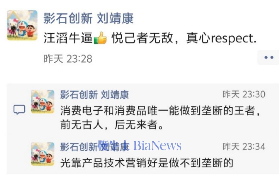 10月29日,影石创新董事长刘靖康在朋友圈先是盛赞大疆董事长汪滔“牛逼”,随即话锋一转,称其为“消费电子领域唯一能垄断的王者”,并暗示其背后另有手段。