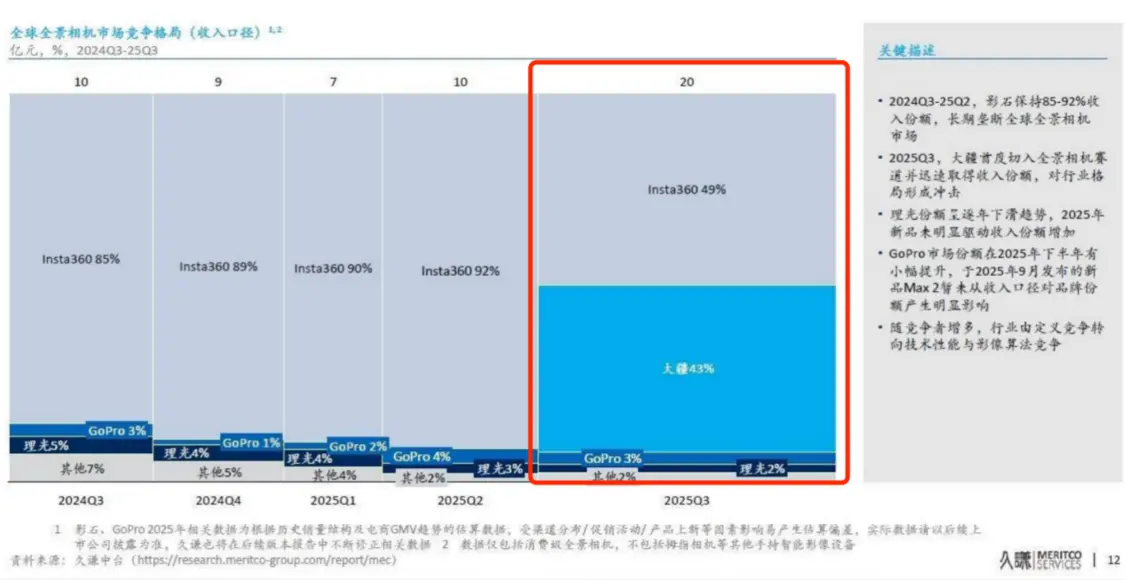 这番“阴阳式”喊话迅速发酵,而其背后,是残酷的市场现实:就在他发表评论的前两天,久谦咨询的报告显示,2025年三季度大疆在全景相机市场推出首款产品不到三个月,便拿下全球43%的市场份额 ,直取影石腹地。