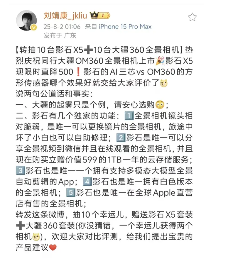 大疆凭借其规模优势,以降价挤压对手生存空间;而体量尚小的影石,则试图通过更灵活的营销在舆论场上破局。