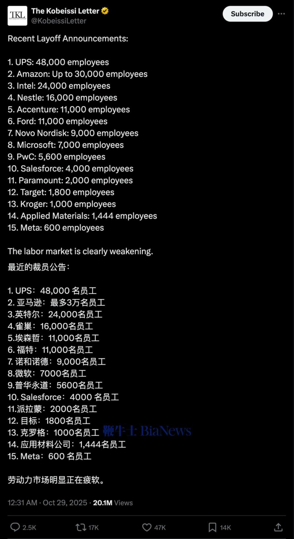 这是亚马逊正在上演的修罗场。这家科技巨头的股价逼近历史高点,裁员的大刀却悄无声息地落下了。而且,这仅仅是个开始——最终被裁人数可能高达 30000 人,占员工总数的近 10%。有人还在毛里求斯的海滩上晒太阳,手机突然弹出一条通知:你被解雇了。最近一个季度,亚马逊公司运营表现良好,为什么突然要进行如此残酷的裁员?官方给出的理由,和过去这段时间以来裁员的公司一样,因为 AI。亚马逊的人力资源主管 Beth Galetti,在给全体员工的备忘录中写着,「AI 是自互联网以来,我们所见过的最具变革性的技术」。她解释说,正因为 AI 能让公司更快地创新,所以亚马逊需要「更精简的组织、更少的层级」。听着又是熟悉的话术,用 AI 能降本增效,更少的层级。可亚马逊这次裁员,背后的目的,可不仅仅是因为 AI 能替代这些员工。过去十几年来,一个大公司的标志,大概就是人很多,产出也很多,每个部门都有一个,甚至多个自己的产品。但 AI 时代的逻辑,直接变成了,更多算力、更少人。像 OpenAI 一样,估值快要来到万亿美元,公司总人数才从 2023 年的几百人,到现在大约四千人。在亚马逊,这种转变更是从上到下、明码标价。CEO 安迪.贾西(Andy Jassy)就在系统性地构建一个「AI 改变一切」的叙事。Jassy 的核心理念是,他希望「亚马逊像世界上最大的初创公司一样运营」。他要不惜一切代价地精简、减少官僚主义和消除层级;在官方的裁员公告里,也完美的呼应了这一点。这套「AI 精简叙事」并非空穴来风,它甚至精准地打击了特定的人群:中层管理者。根据商业内幕获取的内部数据,在第一批美国裁员中,超过 78% 的被裁员工是 L5 到 L7 级别的经理。涉及的部门包括 HR(People Experience & Technology)约 15% 的职位;设备与服务部门(Echo、Fire、Kindle团队);Audible 音频部门;以及部分 AWS 企业支持团队。根据 Levels.fyi 的数据,2025 年一个 L5 的总薪酬约为 12 万美元,L6 约为 21 万美元,而 L7 约为 28 万美元这些中层管理者,他们的日常工作,概括性地说,大部分是协调跨部门沟通、汇总信息、撰写状态报告、起草备忘录。听起来,这不就是当前生成式 AI 最擅长的任务。亚马逊似乎在用行动证明,AI 正在掏空企业的中间层。裁员重灾区之一的设备部门(负责 Kindle、Echo 等产品),其副总裁 Tapas Roy 在裁员后的内部信中,直白地要求留下的员工要拥抱 AI(lean in on AI)来提高效率。表面上看,这是一个「AI 提升生产力,导致人类白领失业」的标准故事。但这个剧本,亚马逊自己人可能都不全信。这场裁员最大的疑点在于:AI 真的已经强大到,可以立刻取代 3 万名白领了吗?最具讽刺意味的是,根据 CNN 的报道,一位亚马逊发言人私下承认,AI 并不是周二宣布的 14000 名裁员中「绝大多数」的原因。这个说法也得到了多位管理学专家的支持。他们提到,整个科技行业目前都存在一种「AI 漂洗」(AI-washing)的趋势,大概意思就是把任何东西,都要包装成 AI。2024 年 7 月至 2025 年 6 月,人工智能相关职位招聘信息中最常用的 15 个关键词,AI 占主要地位,而不是某项具体 AI 技能,如计算机视觉、自然语言处理等「很少有公司现在真的在用 AI 取代人」高管咨询公司 Culture Partners 的首席战略官 Jessica Kriegel 告诉 CNN。她认为,我们现在看到的更像是一种「预防性裁员」(preemptive layoffs)。换言之,亚马逊裁员,不是因为 AI 已经准备好接管人类的工作,而是因为高管们希望腾出「财务跑道」去探索 AI 的可能性。毕竟,就目前而言,AI 带来的除了效率,还有大量的「workslop」,workslop 指的是那些由聊天机器人产生的、看似像回事但实则毫无价值、甚至充满错误的「工作垃圾」。AI 生成的工作废料,像是幻灯片、摘要、代码等,需要人类花更多的时间和精力去处理。有调查发现,AI 参与后有 40% 都是工作垃圾,每一份垃圾要浪费员工两个小时,186 美元。前段时间,MIT 也发布了一项研究,提到 95% 的企业 AI 投资目前回报为零。从试点到实际应用,对于具体任务的 AI(浅蓝色)引入下降明显,成功实施仅有 5%虽然 AI 有能力处理简单的记录任务,但对于工作中一些细节性、准确性要求比较的内容,AI 还是没有办法。亚马逊自己也承认,公司还在继续招聘,并且会为大多数受影响的员工提供 90 天的时间,在公司内部寻找新职位。如果 AI 真的已经能系统性地取代这些岗位,为什么还要费力进行内部转岗。显然,AI「取代」人类的故事,说服力还不够。那么,真正的动机是什么?如果 AI 不是直接凶手,那它很可能就是动机。这场裁员的第一个真正原因,可能和 AI 有关,但不是因为用 AI 更便宜,而是因为 AI 太贵。亚马逊正处在一场耗资万亿、赢家通吃的 AI 战争中。在这场战争中,它必须要拼命地追赶对手。2025 年,亚马逊云服务 AWS 市场份额占据领先地位亚马逊的核心利润来源,AWS(云服务),其增长速度已经落后于微软的 Azure 和谷歌云。亚马逊需要快速释放大量现金,来招聘昂贵的 AI 专家和建造数据中心。这笔开销正以前所未有的速度上升。2024年,他们在服务器与数据中心建设上的支出,就已经突破 850 亿美元。2025 年预计将再增加 40%,达到 1200 亿。每削掉 1% 的白领薪酬预算,就意味着公司能多买几千块 H100 GPU。分析师们一针见血地指出,「亚马逊短期内面临着压力,需要抵消在建设 AI 基础设施方面的长期投资」。我们使用的 ChatGPT、Claude 都强烈依赖于这些云服务;Claude 