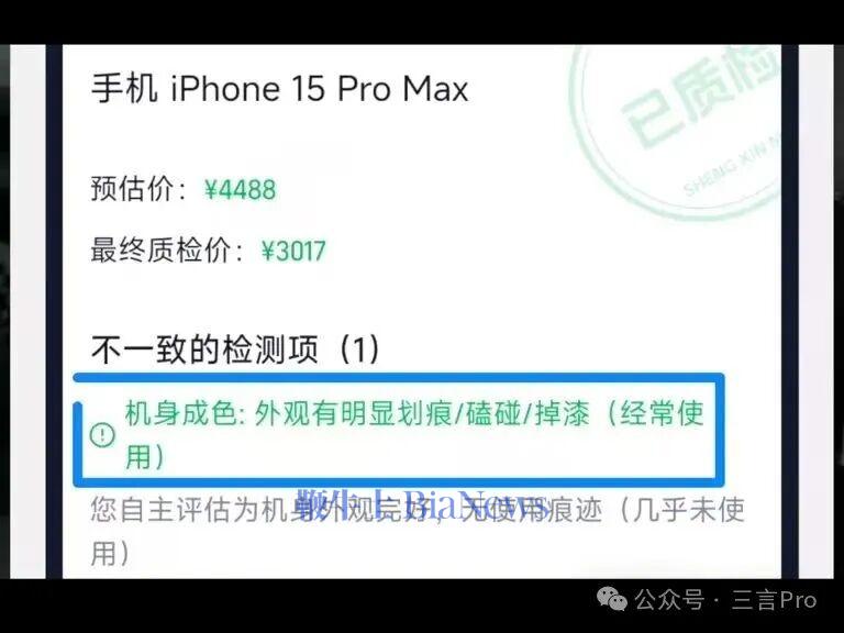 10月15日,平台显示已经收到旧手机。然而,回收价格却变为3017元,与之前平台显示回收价相差1471元,而理由则是旧手机存在明显磕碰划痕和掉漆。