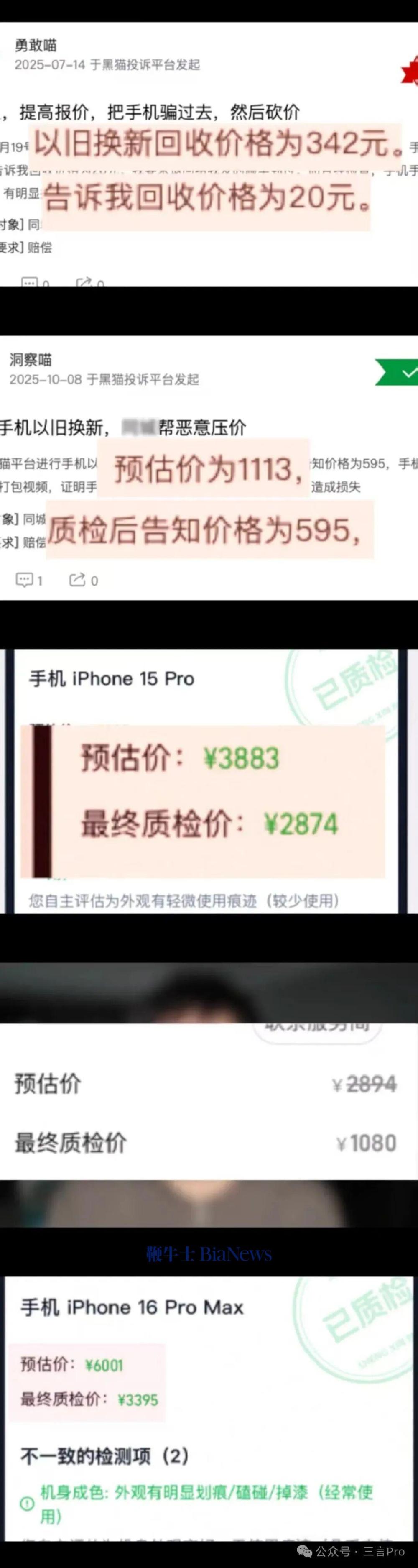例如有网友约定6001元手机回收价格,到手后也以磕碰为由压价到3395元;有网友约定回收价2800余元手机,最终压价到1080;甚至还有约定回收价342元的手机,被压价至20元的情况。