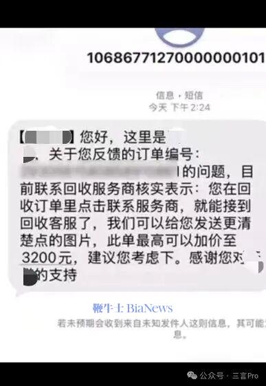 然而,提出要回收商出具开箱视频诉求后,该博主称并未收到任何视频,仅在之后收到一条短信通知称,是否愿意以3200元回收价回收手机。