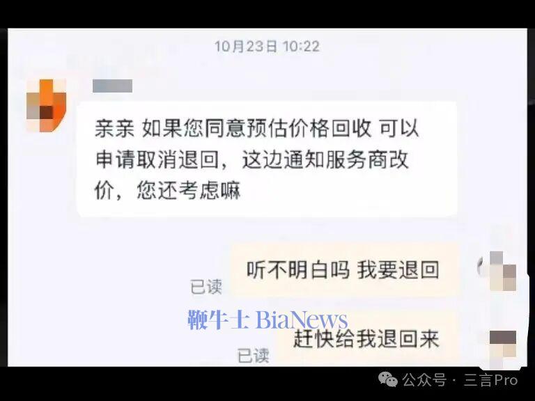 然而,自从申请放弃回收后次日起,博主称就开始多次接到电商平台专员电话。对方开始“讨价还价”,回收价从3200元一路涨至3600元。博主均不接受,并且更不认同平台同消费者讨价还价的逻辑,坚决要求放弃回收。