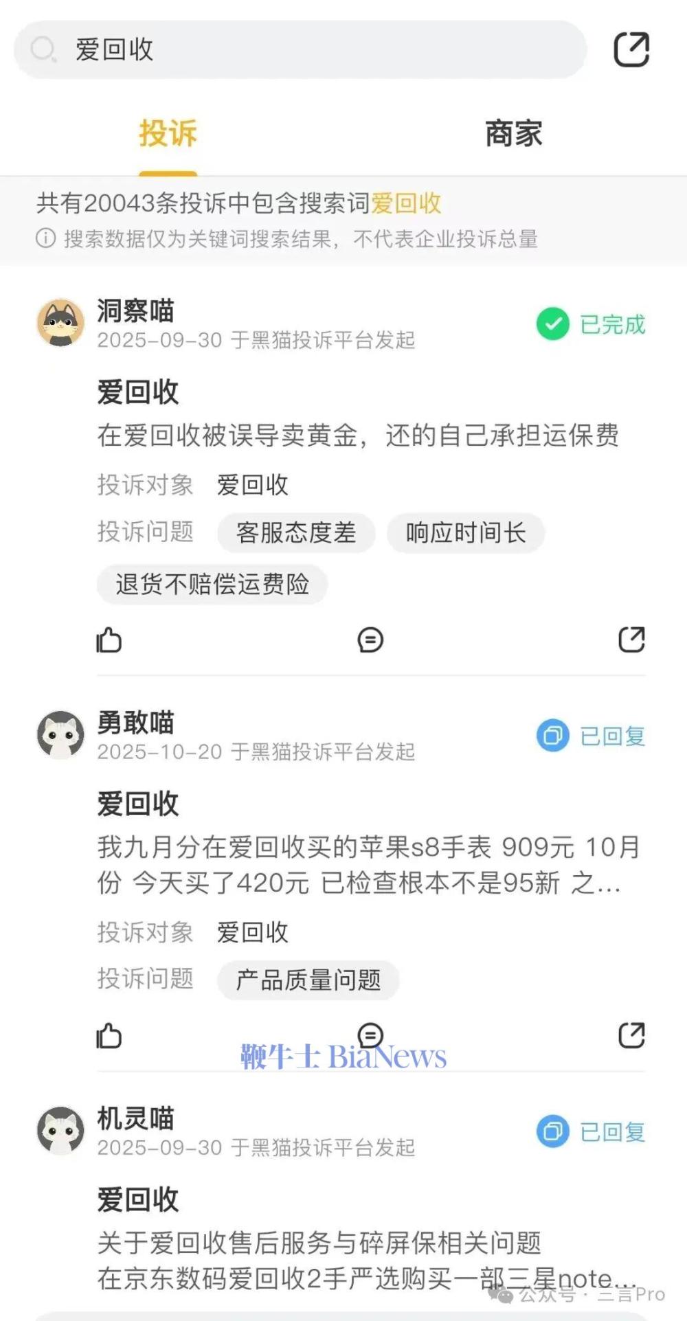 例如在新浪黑猫投诉平台上,有关爱回收的投诉信息高达2万余条;