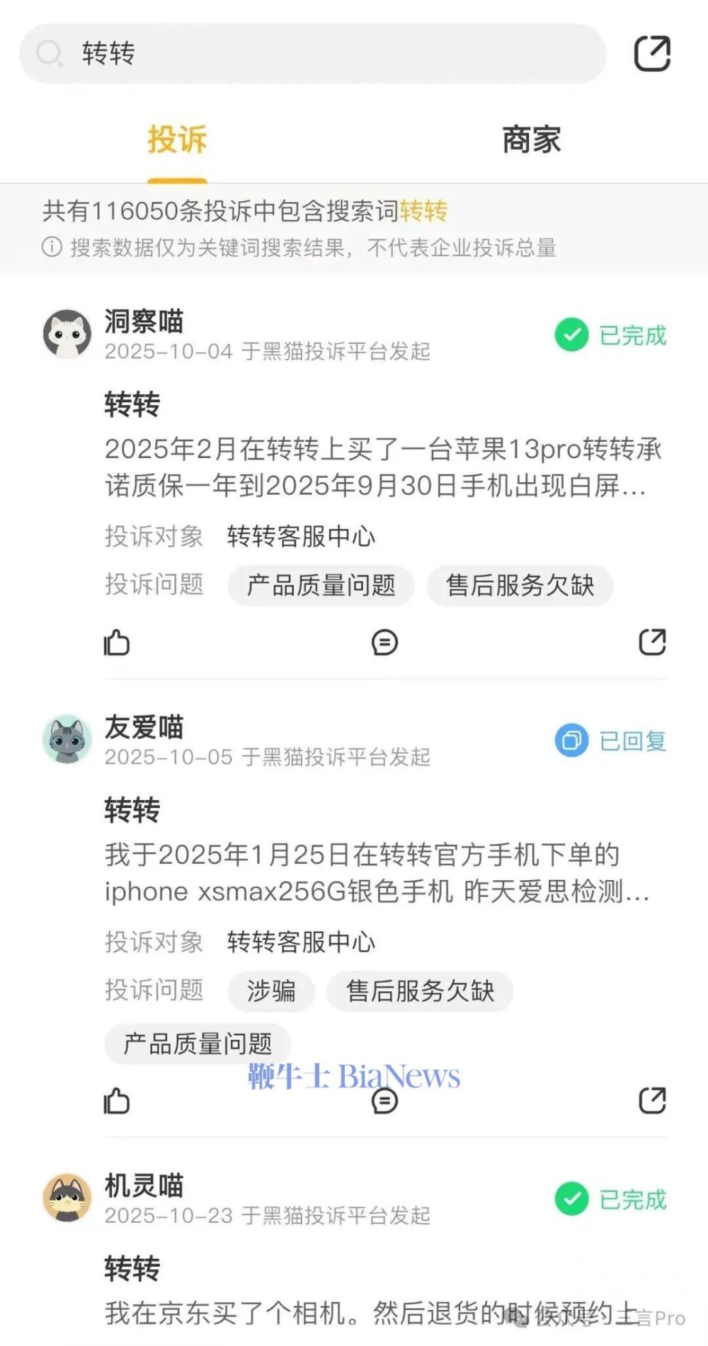 而关于转转的投诉信息数量更是高达11.6万余条。
