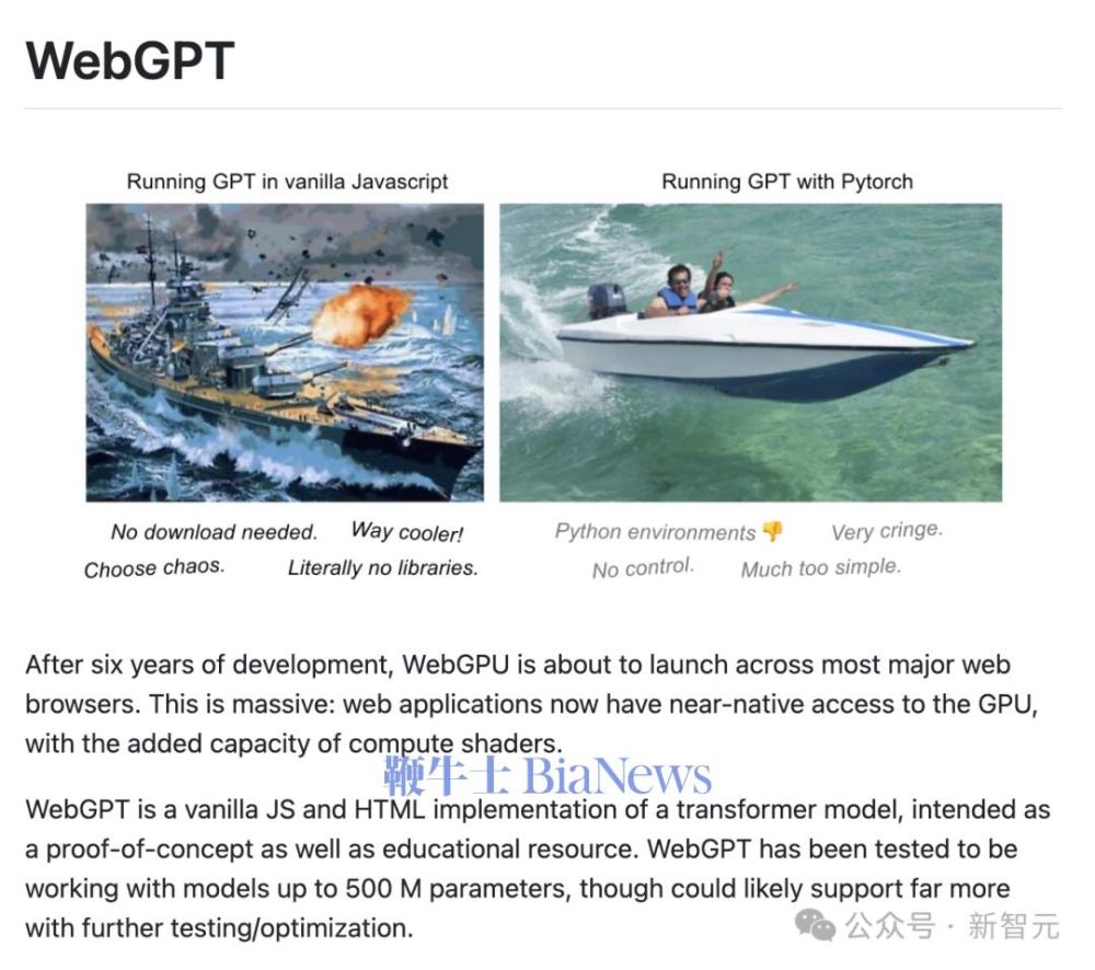 一个基于浏览器的GPT实现,WebGPT,Github上有3700个Stars。这个项目的初衷是,WebGPU即将在大多数主流浏览器上推出。