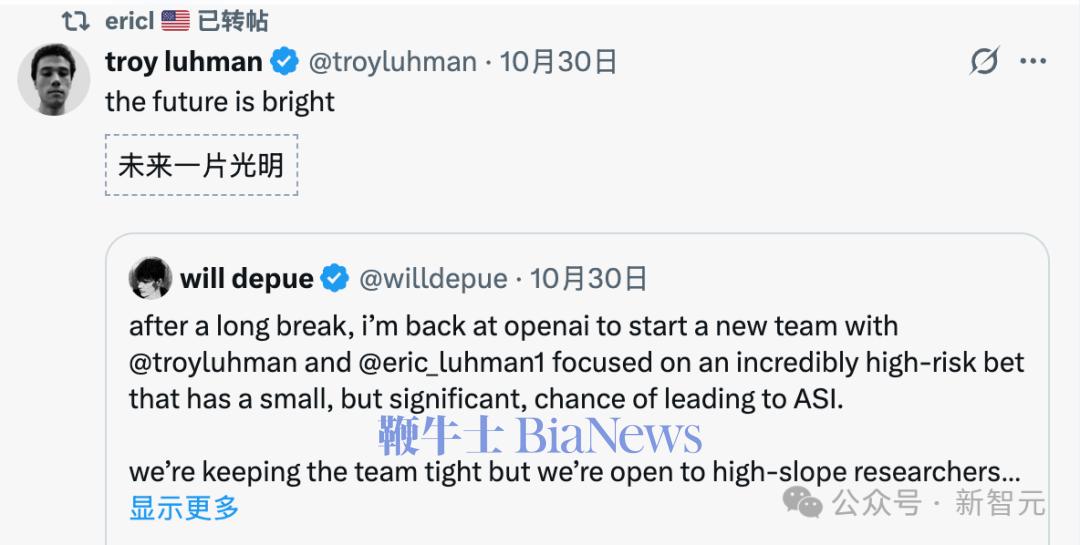 只有今天Troy Luhman转发了Will DePue的帖子,「未来一片光明」,看来他们对实现超级人工智能非常乐观。