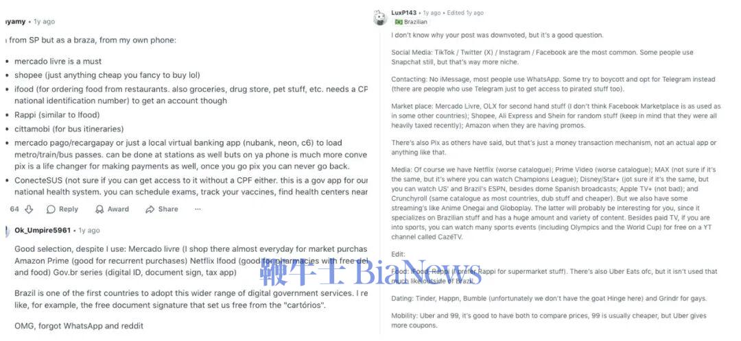 Reddit网友们推荐在巴西使用的app,涉及各个领域、每个领域的产品都很丰富。