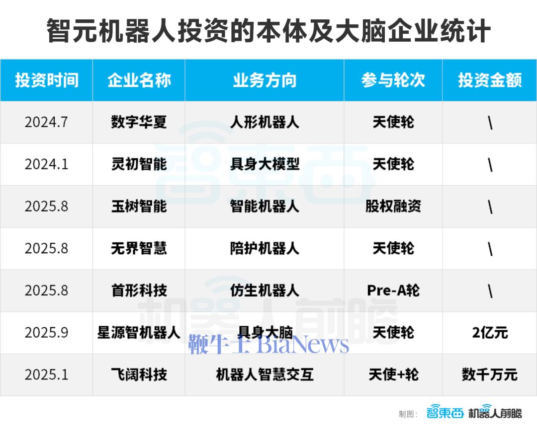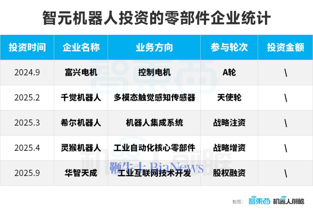 智元能如此密集进行投资布局,与团队、技术与资本的加持密不可分。9月19日,智元在官网上正式披露了合伙人团队名单:邓泰华任创始人、董事长、CEO;彭志辉任联合创始人、总裁、CTO;姜青松任合伙人、高级副总裁、营销服总裁;姚卯青任合伙人、高级副总裁、具身业务部总裁;王闯任合伙人、高级副总裁、通用业务部总裁;罗剑岚任合伙人、高级副总裁、首席科学家;钮嘉任合伙人、副总裁、首席人力资源官。核心成员大都出身“华为系”:邓泰华曾任华为副总裁、计算产品线总裁,还曾担任华为无线产品线负责人,是华为昇腾AI业务核心负责人;彭志辉是原华为“天才少年”计划入选者;姜青松曾任华为海外企业国家主管、运营商解决方案副总裁。在本体、小脑和大脑层面,智元都进行了布局。硬件上,其产品有远征、灵犀、精灵、绝尘四大系列,覆盖工业、物流、文旅、家庭陪伴、科研教育、商用清洁等场景。智元的产品线看似分散,实则是基于客户需求差异较大的行业现状,通过多形态产品覆盖更多应用场景。邓泰华还表明,“明年公司会把重点放在进工厂、进家庭的初步实践上,慢慢从to B走向to C。”大脑方面,智元在3月发布通用具身基座大模型——智元启元大模型(Genie Operator-1)。该模型采用ViLLA架构,可借助人类视频进行学习,在新场景和新任务上实现小样本快速泛化,并支持部署到不同的机器人本体。9月23日,智元开源了这款大模型。针对具身智能高质量数据匮乏问题,智元通过自有的数据采集工厂,形成数据集AgiBot World并开源,覆盖家居、实验室、零售卖场等数百个场景。除了构建全面的产品生态,智元还通过推出开发平台,提升该生态的开放性。10月24日,智元发布0代码机器人内容创作平台——灵创平台,让用户即便没有专业的编程基础和专业设备,也能用该平台直接生成可供人形机器人执行的动作指令。团队背景与产品布局,是智元获得资本关注的重要原因。智元估值在成立后不到半年就突破了10亿美金,成为全球最快跻身独角兽的一家具身智能公司。截至目前,智元已经完成了10轮融资,估值达150亿。最近的一轮融资发生在今年8月,其获LG电子、韩国未来资产集团战略入股。据悉,智元将在今年年底完成C轮融资,并将引入更多国际产业投资方。智元背后的产业股东阵容豪华,有比亚迪、三花控股、立景创新、尚颀资本、北汽、TCL、卧龙电驱、软通动力、京东、百度、腾讯等。这些产业股东,或将为智元带来潜在的机器人应用场景合作机会。智元机器人预计,今年出货数千台,明年出货数万台,未来几年计划实现年产几十万台的规模。在机器人核心零部件领域,智元的布局呈现出‘锁定关键部件+联动本体开发’的特点:一方面重点投资电机、驱动器、传感器、触觉感知等相关企业,提升供应链稳定性;另一方面,智元不是单纯的财务投资,还通过签署战略合作协议,推动场景协同,和本体开发相互促进,并且学习借鉴其中一些上游厂商成熟的商业化经验,拓展商业渠道。根据公开信息,在上游零部件领域,智元目前投资的企业共有5家。富兴电机是一家中国、瑞士、德国合资企业,生产全系列伺服电机、直流无刷电机、混合式步进电机及相关的驱动器。千觉机器人的核心产品包括高分辨率多模态触觉传感器、触觉感知与控制智能化模组等。希尔机器人开发了一大批全数字化伺服驱动产品,双方曾签署场景应用协议;其是卧龙电驱的子公司,卧龙电驱也与智元机器人完成了战略投资签约。灵猴机器人是博众精工的子公司,产品涵盖了视觉部件以及直线电机、工业机器人和AGV等运动部件;双方之前合作过智元“远征”系列轮式人形机器人项目。华智天成控股方为A股上市公司华天科技的母公司——天水华天电子集团,后者已经和智元签署了具身智能战略合作协议,推动机器人在封测产线高精密、重复性环节的规模化应用。机器人本体层面,智元投资了数字华夏、首形科技这类聚焦情感交互与高仿生技术的公司,还投资了更关注刚需场景应用如城市环卫、康养陪护的玉树智能和无界智慧。在不同的模型技术路线上,智元通过自研、合作及投资进行多样化探索:内部自研具身智能模型启元大模型GO-1,外部和Physical Intelligence达成合作,目前还投资了具身模型公司灵初智能、星源智机器人。智元与这些企业的合作同样远不止与投资,还涉及技术协同研发、产品孵化与应用等。根据公开信息,在机器人本体及大模型相关领域,智元目前投资的企业共有7家。数字华夏与智元机器人联合开发了仿生机器人夏澜,颈部以上部分由数字华夏自行研发,颈部以下部分的肢体则是双方联合开发。灵初智能推出了Psi R1模型,具备基于“Chain of Action Thought(CoAT)”框架的自主推理能力,能够在开放环境中完成复杂决策。玉树智能是环卫龙头企业玉禾田集团的子公司,主要研发无人驾驶清扫车、智能分拣机器人、巡查无人机等适用于各类场景的智能机器人产品。无界智慧专注于陪护机器人的研发与应用,为康养陪护及医疗领域提供智能化解决方案并打造具备自主感知、理解、决策与执行能力的服务机器人系统。首形科技专注于超高仿生情感交互机器人研发,自研的CharacterMind是一款面向未来交互的情绪基座系统,能为机器人、数字人以及各种具象化AI角色注入真实的情绪感知与表达能力。星