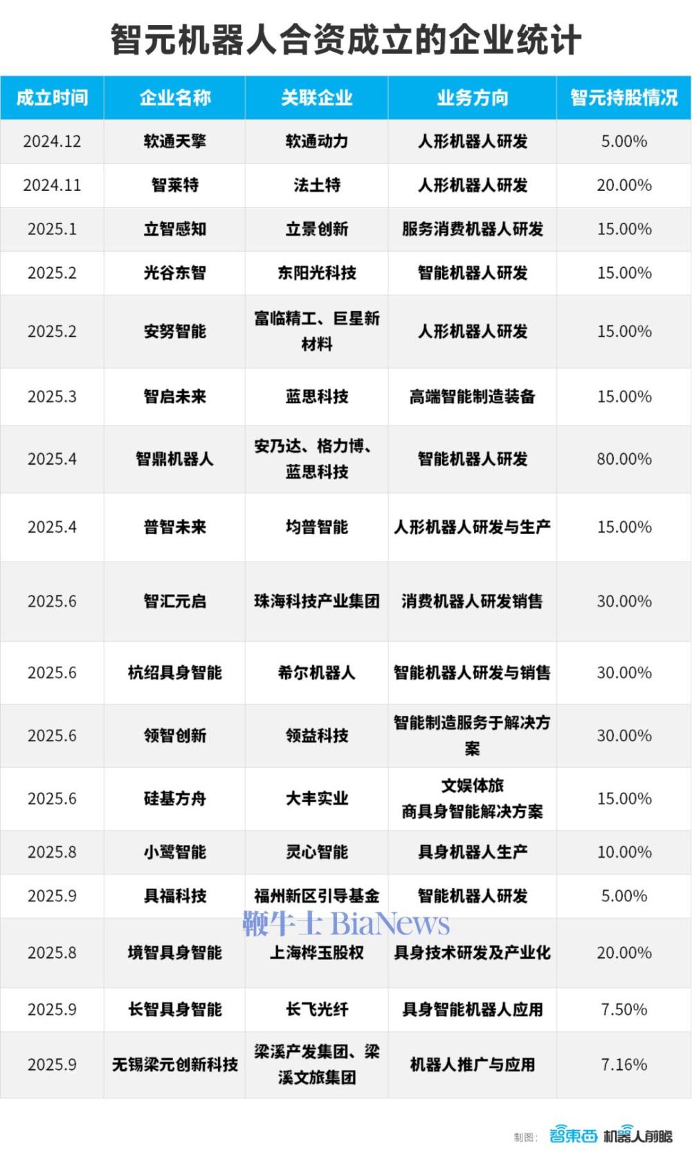 过去一年多时间里,智元机器人就像一艘“资本航母”,以与一般创企完全不同的姿态在具身智能产业里航行。7月,智元宣布收购上纬新材,此后这家公司股价连日涨停,如今股价已经比7月初上涨十余倍。创始人、董事长兼CEO邓泰华在8月时透露,智元已经投资了15个早期项目,其中七成由其主导孵化,其余则押注在种子和天使阶段。与此同时,其9月还与高瓴联手设立了数亿元规模的具身智能产业基金,发掘和支持具身智能产业链相关项目,并在筹建更大体量的CVC平台。这些动作背后,智元的投资动作有两条清晰的主线:一方面直投本体与大模型公司,如数字华夏、首形科技、灵初智能、星源智机器人;另一方面重仓关键零部件企业,包括千觉机器人、灵猴机器人、富兴电机。此外,智元还通过合资设立至少17家新公司,借力上市公司或地方产业集团,切入产能、渠道与场景。