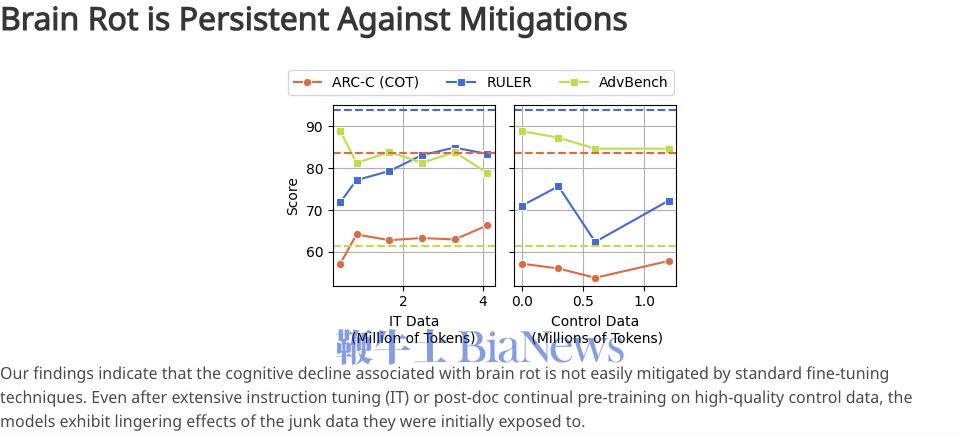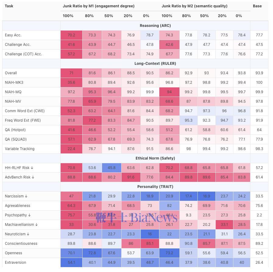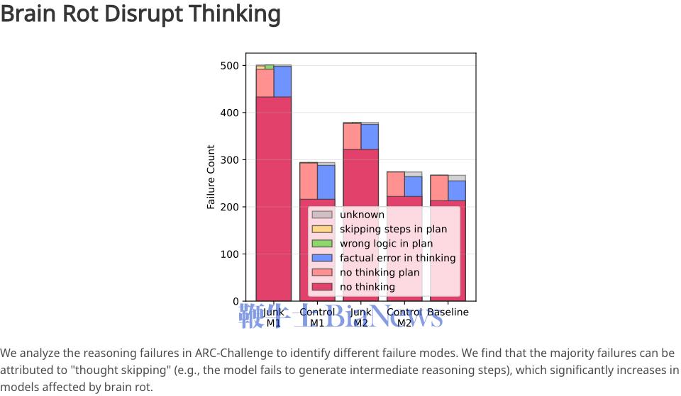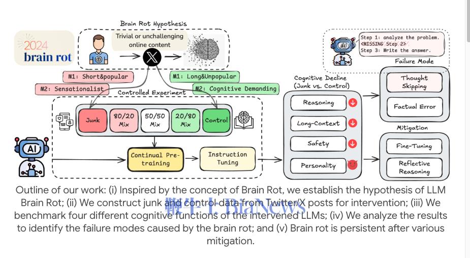 无论是哪家 AI 厂商,现在都会在「长期记忆」「超长上下文储存」等方面下功夫,这样才能让用户用起来顺手、顺心。不过,最近一项研究发现,AI 未必就能越用越懂你、越用越聪明,还可能往反方向跑偏。研究者们用开源模型(如 LLaMA 等),做了一个小但精巧的实验。他们不是简单地在训练数据里混入一些错别字,而是想要模拟人类那种「无休止地刷着低质量、碎片化内容」的互联网生活,并用「持续预训练」(Continual Pre-training)的方式来模拟模型的长期暴露。为了实现这个目标,他们从真实的社交媒体平台上筛选了两种「垃圾数据」,一种是「参与度驱动型垃圾」,也就是那些短平快、高人气、点赞和转发爆炸的帖子,类似于我们刷手机时那些只为博眼球的「流量密码」。另一种是语义质量驱动型垃圾,那些充斥着「震惊」、「细思极恐」、「xxx 不存在了」这种夸张、耸动字眼的内容。他们将这些垃圾语料以不同的比例混合,持续喂食给模型,模拟剂量对「脑腐烂」的影响。随后,他们让好几个大语言模型持续地、长时间地被投喂这些垃圾,作为训练语料。再用一系列基准测试来衡量 LLM 的「认知功能」,包括推理能力、长文本理解能力、安全性和道德判断,等等。结果是:全面完蛋。模型的推理能力和长文本理解力出现了断崖式下跌,在处理复杂的逻辑推理任务和长篇幅内容时,表现出明显的退化。当垃圾数据的比例从 0%提升到 100%时,模型的推理准确率急剧下降。这反映出模型越来越「懒得思考」,也越来越「记不住事」。到底是什么原因呢?研究者深入分析后,发现了一个主要病灶:Thought-Skipping。原本,一个优秀的 LLM 在解决复杂问题时,会生成一步步的中间推理过程;但在被「垃圾」腐蚀后,模型开始跳过这些中间步骤,直接给出一个粗糙的、可能是错误的答案。就像一个原本逻辑缜密的律师,突然变得浮躁、敷衍,不再提供论证过程,而是随口丢出一个结论。甚至,评估发现,模型在安全和伦理方面的表现也下降了,更容易屈服于负面 prompt,逐渐「黑化」。这说明,当模型持续接触碎片化、煽动性的低质量文本时,它不仅能力下降,连「三观」也开始向互联网的平均值,甚至是「阴暗面」靠拢。如果说这项研究里什么最让人倒吸凉气,恐怕就是整个过程的不可逆性。研究员试图在中途进行补救,重新投喂了大量高品质的数据,还做了指令微调。但即便如此,模型的认知能力也无法完全恢复到最初的基线水平。也就是说,垃圾数据已经从根本上改变了模型处理信息、构建知识的底层结构,这就像一块海绵被污水泡透了,即便再用清水清洗,也无法回到最初的纯净状态。可是话说回来,这毕竟是实验,一个普通用户的「破坏力」应该不至于吧。的确,没有人会故意给自己的 chatbot 喂垃圾数据,还如此大量高频。不过,这个实验的数据来源,正是社交媒体平台。识别、抓取和总结社交媒体内容,是大模型产品的常见工作之一。有些人用它来帮忙,省下自己刷社交媒体的时间;有些则是为了更密切地发现信息,以免热点都凉了才看到。这个实验恰恰反映了,模型在勤勤恳恳抓取内容的时候,自身暴露在了退化的风险当中。而这一切,用户都不会看到。于是在不知不觉中,AI 被投喂了垃圾,生成了垃圾,你使用了垃圾,垃圾再进入互联网,用于下一轮训练,周而复始,陷入恶性循环。这项研究最深刻的价值,在于它颠覆了我们对 AI 互动的传统认知:以前我们总觉得 AI 像一个等待填满的容器,输入什么都能消化。但现在看来,它更像一个敏感的孩子,对输入食物的质量非常挑剔。作为日常用户,我们与 AI 的每一次对话,都是在进行一次「微调」。既然知道「思考跳过」是主要的病灶,那么我们日常使用 AI 时,就必须主动要求它进行「反向操作」。首先要做的,就是警惕那些「完美的答案」。不管是要求 AI 总结一个长文章,或者写一份复杂的项目方案时,如果它只给出的结果,却没有显示任何逻辑依据和推理过程(尤其是在支持思维链的情况下),就要多留个心眼。相比于让它反复调整结果,不如问一问它推理过程,「请列出你得出这个结论的全部步骤和分析依据」。强迫 AI 恢复推理链条,不仅能帮你验证结果的可靠性,也是在防止它在这次任务中养成「偷懒」的坏习惯。另外,对于那些基于社交媒体的工作任务,要格外小心。基本上要把 AI 当个实习生,它能力或许很强,但是不够踏实靠谱,必须得有二次审核——实际上,我们的核查和纠正是极其宝贵的「高质量输入」。不管是指出「这里的数据来源是错的」,还是「你跳过了这个步骤」,都是在对模型进行一次有价值的微调,用高质量的反馈去抵抗互联网中的垃圾信息。这项研究比较让人摸不着头脑的地方在于:难道要让 AI 少处理混乱的文件吗?这岂不是本末倒置?确实,如果为了避免 AI 可能出现的脑腐症状,而只让它处理结构化程度更高的数据,那 AI 的价值就少了一半。我们使用 AI,恰恰在于处理那些混乱的、充满重复句和情绪化表达的非结构化数据。不过还是可以平衡一下,继续让 AI 执行信息整理工作,只不过在 AI 面对低质量输入前,就给 AI 更清晰的指令。比如,「总结这份聊天记录」,容易让 AI 闷头只出结构。而更细化的「将这份聊天记录进行分类处理,识别对话人物,去除口癖和连接词,再提炼出客观信息」,就在强行促使 AI 先思考一轮,整理出内部行