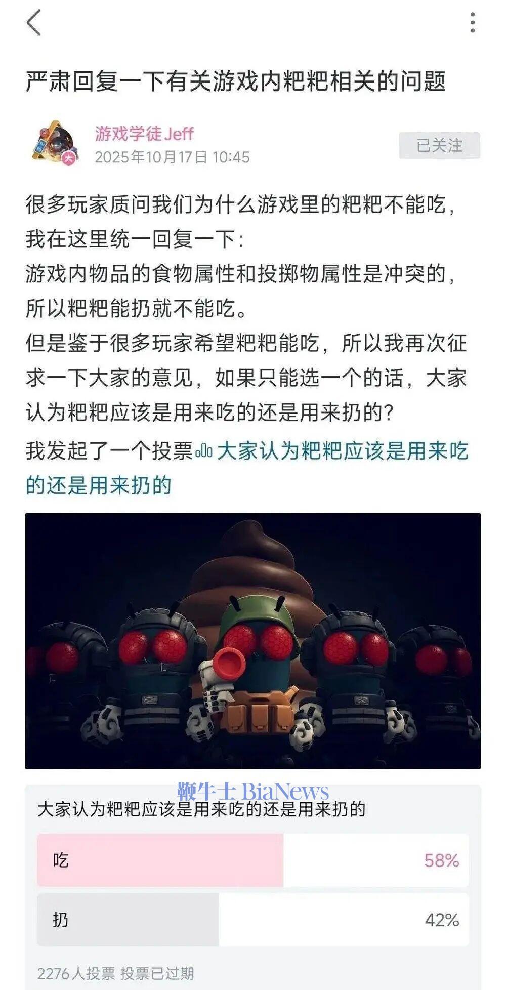 想必很多读者会好奇:为什么要在游戏里从马桶掏粑粑吃?事情的起因,是 Jeff 被玩家逼到了墙角——网上不断有人追问:“为什么粑粑只能扔,不能吃?”Jeff 不堪其扰,专门发起了一次投票,结果显示,希望能在游戏中吃粑粑的网友占比高达 58%。无奈之下,项目组在更新游戏补丁时,只得将粑粑调整为可食用状态。