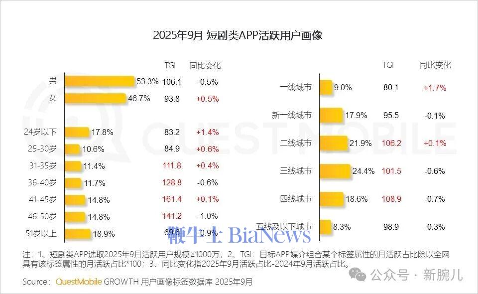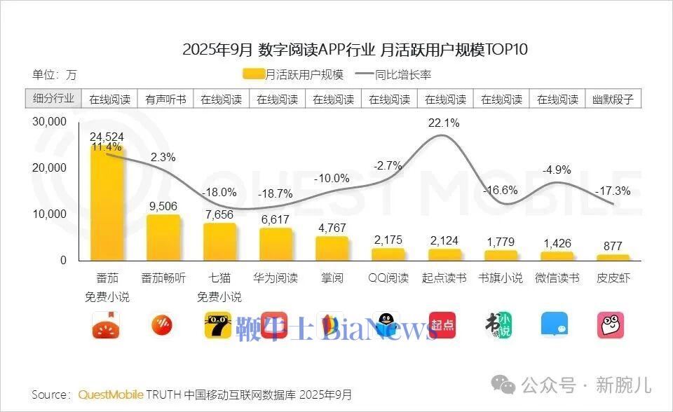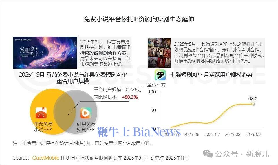 QuestMobile发布的数据显示,红果短剧9月月活已经来到2.36亿,同比暴增95%,河马剧场月活5158万,同比暴增100%。短视频APP行业月活跃用户规模已达11.29亿,活跃渗透率近90%。抖音月活9.36亿,持续领跑,快手4.58亿,稳居第二,行业呈现“头部集中、中尾部承压”格局。在暑期效应和短剧内容火热的双重驱动下,在线视频行业保持高活跃度,用户月人均使用时长超20小时。热门短剧APP扰动在线视频行业格局,红果免费短剧月活2.36亿,跻身TOP4,短剧第一。河马剧场月活跃用户规模突破5千万。短剧正打破圈层界限,31-50岁为短剧主要受众群体,更多30岁以下年轻用户及一二线城市用户对短剧的兴趣正在上升。QuestMobile数据显示,截止2025年9月,番茄免费小说APP月活跃用户规模达2.45亿,同比提升11.4%,持续领跑数字阅读行业,番茄畅听、七猫免费小说APP月活跃用户规模分别达到9506万和7656万。QuestMobile数据显示,2025年9月,抖音旗下番茄免费小说与红果免费短剧重合用户规模达8,726万,同比增长80.3%,显示出“阅读—观看”闭环正在形成;与此同时,七猫短剧APP自上线以来用户稳步增长。(转载自新腕儿)