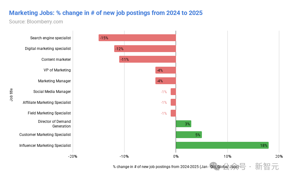 营销领域正在分裂为传统营销岗(萎缩)和网红营销岗(增长)。