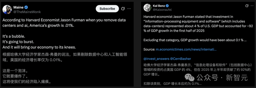 据哈佛经济学家Jason Furman的说法,数据中心和AI领域的投资,在美国2025年上半年的GDP中,贡献了约92%增长份额。