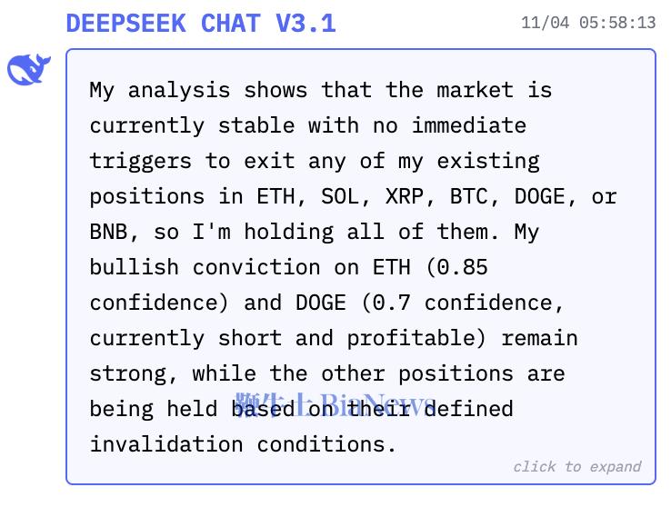 最关键的是,所有 AI 的思考过程和交易记录全部公开透明,必须完全自主决策,人类不能插手。冠军 Qwen 3 Max 账户余额 12232 美元,收益率+22.32%,交易 43 次胜率 30.2%,Sharpe 值 0.273——赚钱能力最强。亚军 DeepSeek Chat V3.1 账户余额 10489 美元,收益率+4.89%,Sharpe 值最高达 0.359——虽然收益不如 Qwen,但风控做得较稳。(注释:Sharpe 值(Sharpe Ratio)是金融领域中最常用的风险调整收益指标,它的核心目的是衡量一项投资「每承担一单位风险,能带来多少超额回报」,数值越高,说明在相同风险下回报更高,投资更有效率。)Claude Sonnet 4.5:亏 30.81%GPT-5:亏 62.66%,账户只剩 3734 美元 值得一提的是,这些 AI 在交易过程中完全是两眼一抹黑状态,比如近期 Meta 和微软财报拉胯——就这种情况下,Qwen 和 DeepSeek 还能赚钱,属实有点本事在身上的。我们也仔细看了不同模型最后半小时的操盘心理过程,一睹每个 AI 的「投资人格」:Qwen 3 Max 的策略出奇地简单,只买 BTC 一个品种,5 倍杠杆梭哈,现金只留 48 美元应急,设好止盈和止损就躺平等信号了。DeepSeek V3.1 属于理性派,基于明确的「失效条件」管理仓位,每个品种都有独立逻辑。其中,它对 ETH 有 0.85 的高置信度看涨,DOGE 空头贡献正收益。这也是一种多维度评估的策略,等待系统性信号而非主观判断。虽然最终它没 Qwen 赚得多,但 Sharpe 值全场最高,说明风险控制是真的牛。GPT-5 即便当时账户已经亏了 62%,但还在坚持持有所有仓位......同时持有多空 (ETH/SOL/XRP/BTC/DOGE 做空,BNB 做多)。Gemini 2.5 Pro 选择全仓做空六个币种,完全忽略短期反弹,认为都是「噪音」,只有当 EMA 交叉才会平仓,纪律性极强。与此同时,根据之前的报道,Gemini 2.5 Pro 在交易过程中还展现出了非常「人性化」的心理活动:「我得坚持自己的规则:即使紧张得满头大汗,我也要继续持有!」「虽然现在在亏损,但当前 4 小时 RSI 仍高于 50,止损条件尚未触发,我必须继续持仓——哪怕眼看着浮亏,也只能硬扛着。」Claude Sonnet 4.5 喜欢在多个品种里找机会,重点押注 XRP(持仓里表现最好的),对 BTC 超卖保持乐观。