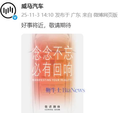 电动知家消息,11月3日,威马汽车通过官方社交媒体发布“好事将近,敬请期待”的海报,并配文“念念不忘,必有回响”。据多家媒体报道,威马汽车预计月底开新车发布会。这是自9月6日发布《致供应商白皮书》后,威马时隔59天的首次发声,预示着这家沉寂已久的新势力车企可能即将重启生产。